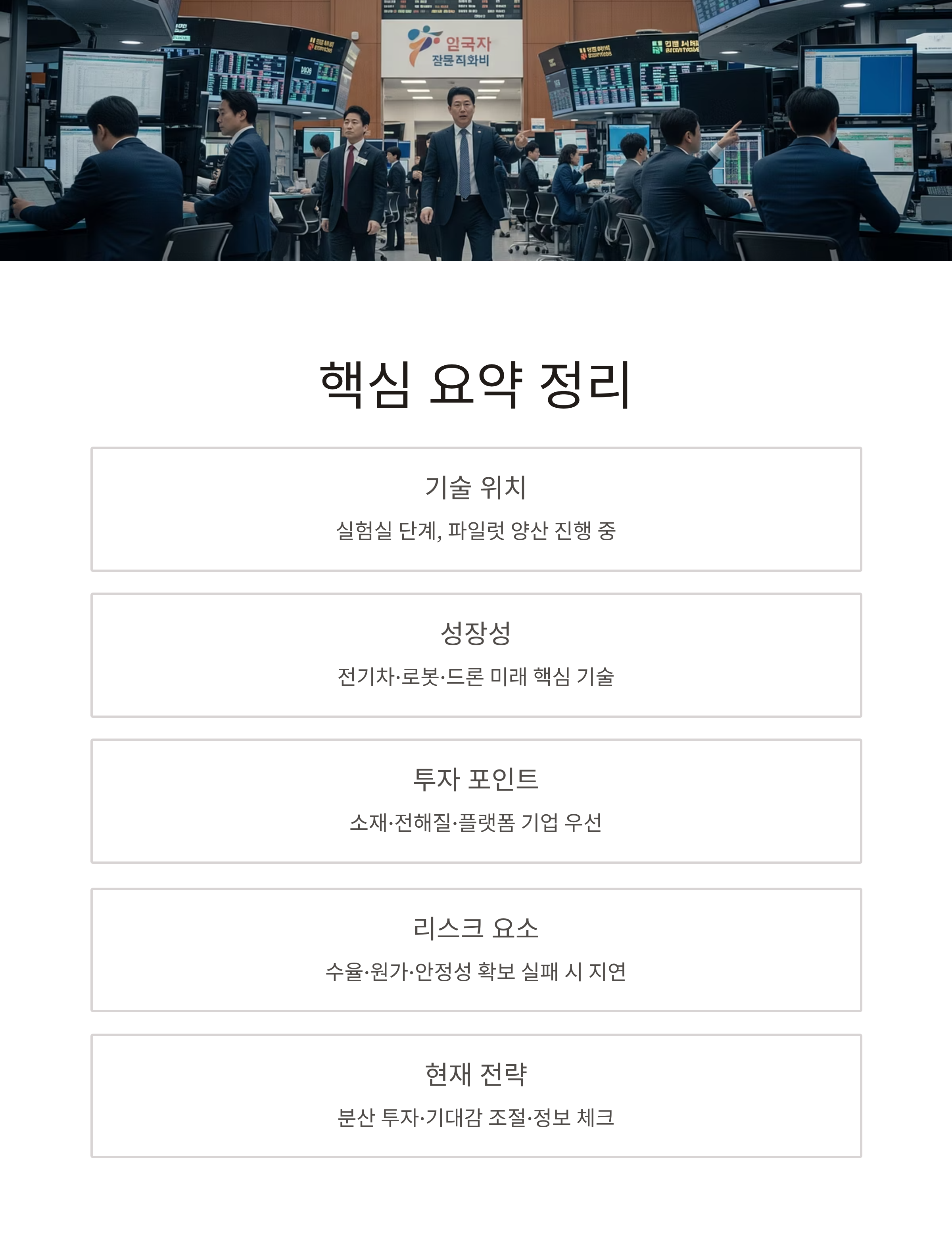 | 성장성 | 전기차 + 로봇 + 드론 → 미래 배터리 시장 핵심 기술 가능성 |