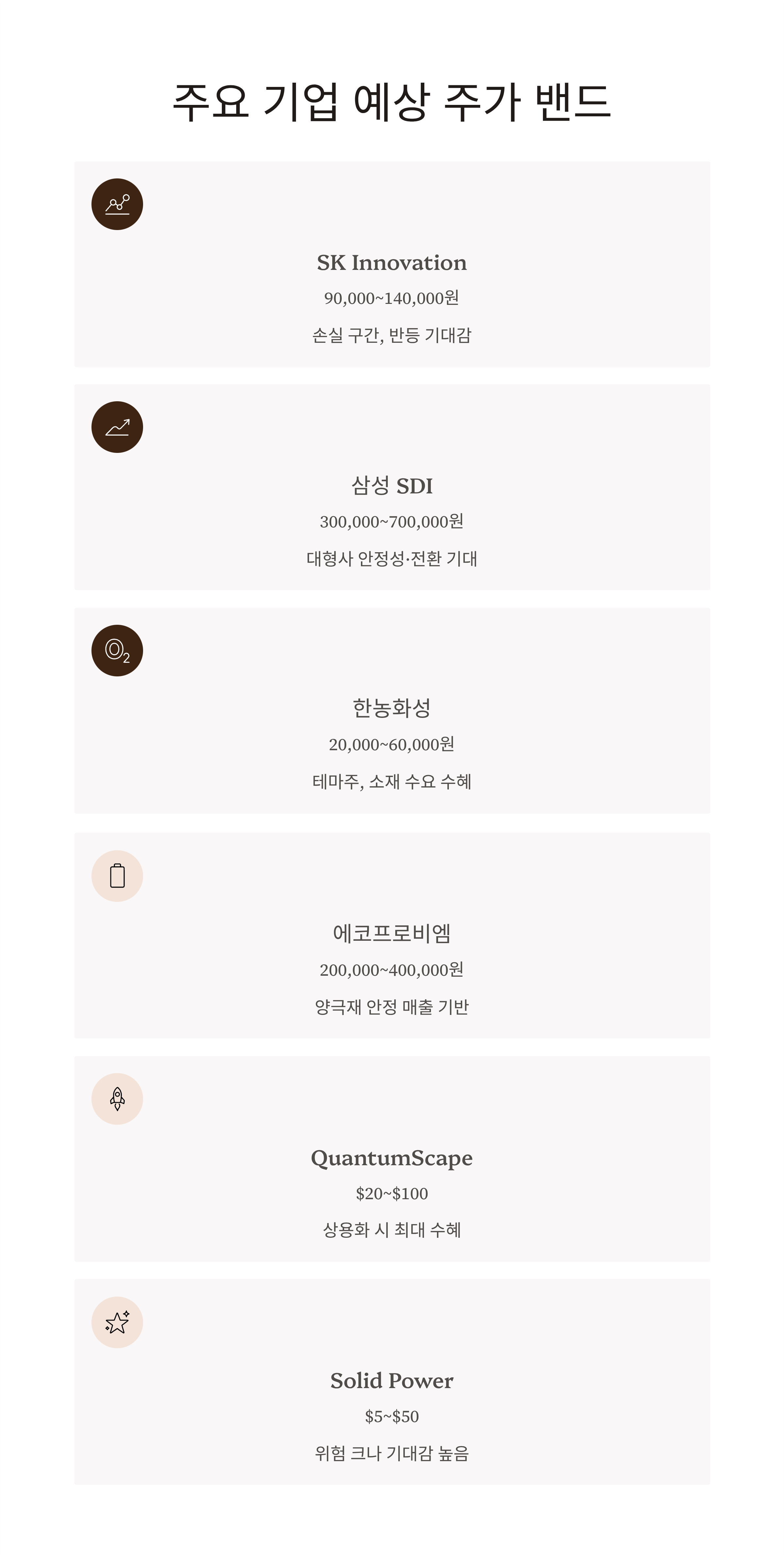 | 삼성 SDI | 300,000 ~ 700,000원 | 대형사 안정성 + 전고체 전환 기대감 반영 |