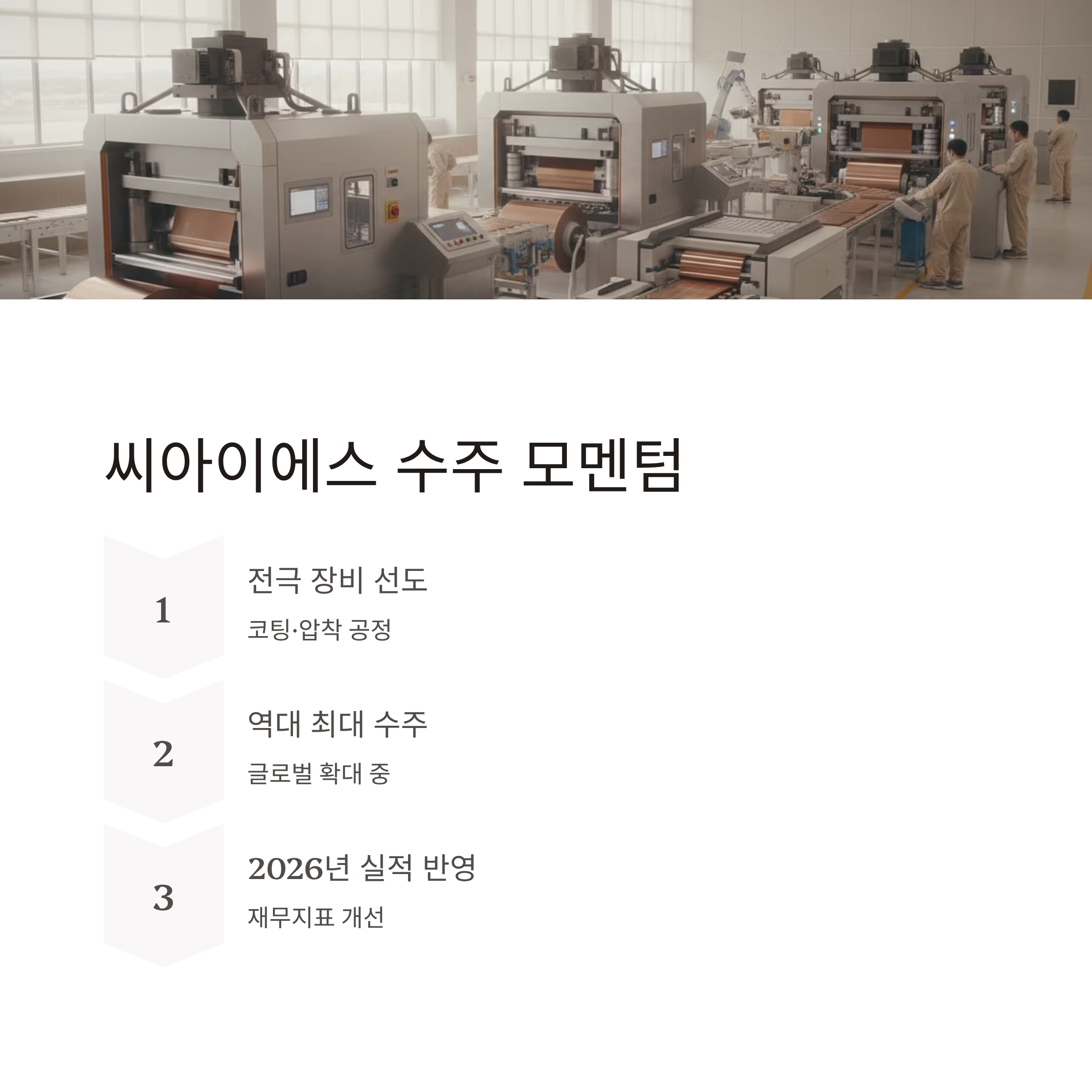 씨아이에스는 전고체용 코팅·압착 장비를 선도하며 역대 최대 수주 잔고를 기록 중입니다.