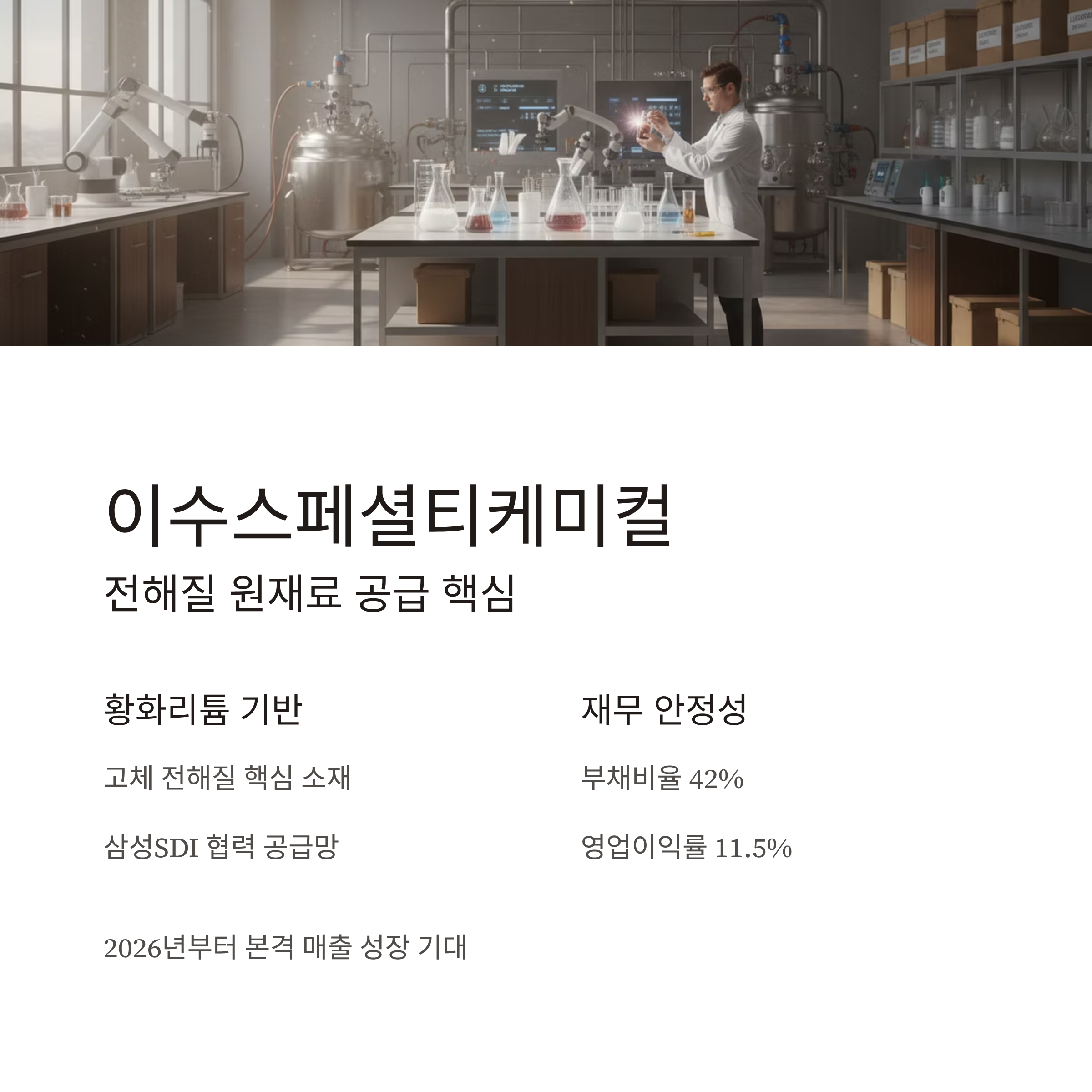 이수스페셜티케미컬은 삼성SDI와의 협력 아래 공급망을 확보하며, 2026년부터 본격적인 매출 성장이 기대되고 있습니다.