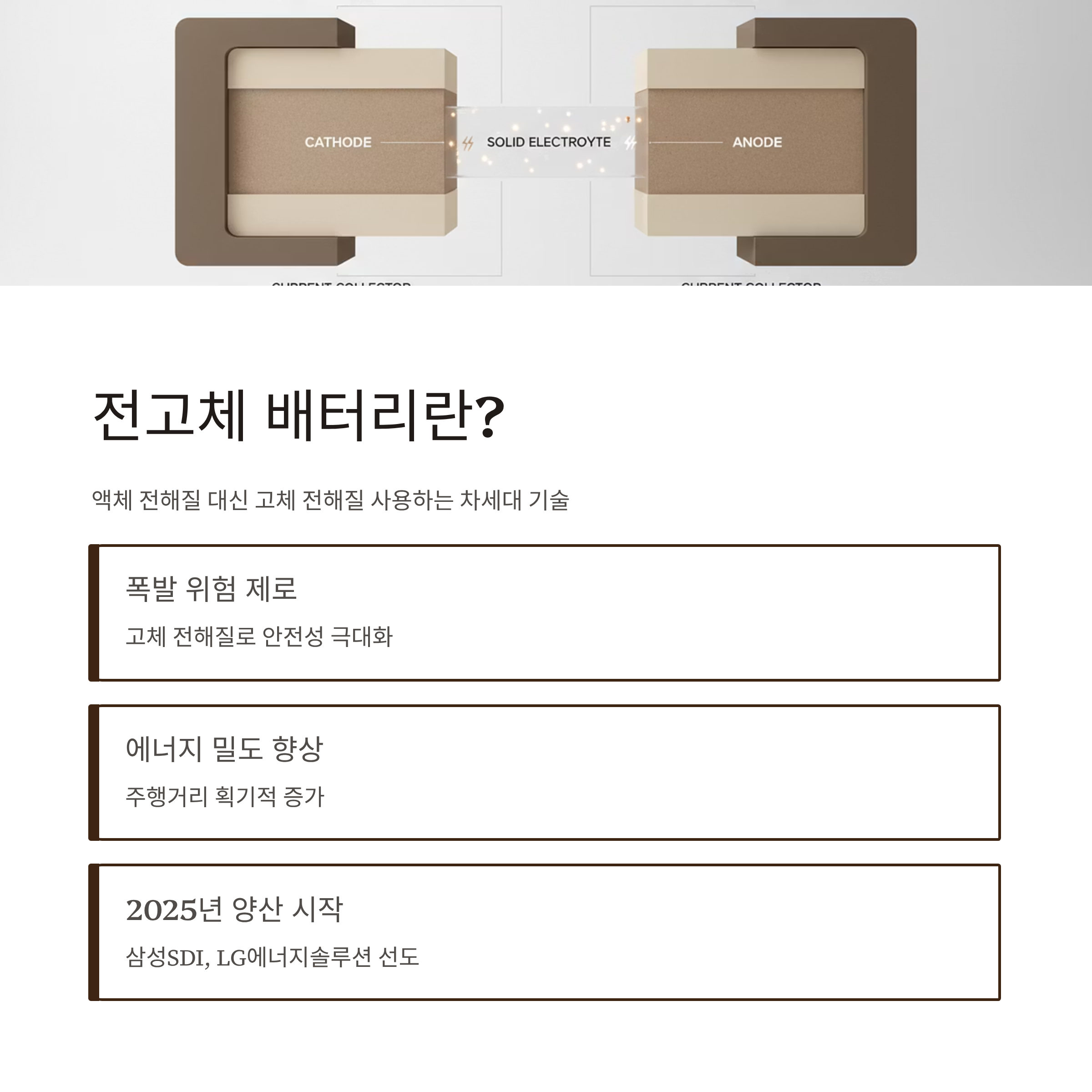 전고체 배터리는 기존 리튬이온 배터리에서 액체 전해질 대신 고체 전해질을 사용하는 차세대 배터리 기술입니다.