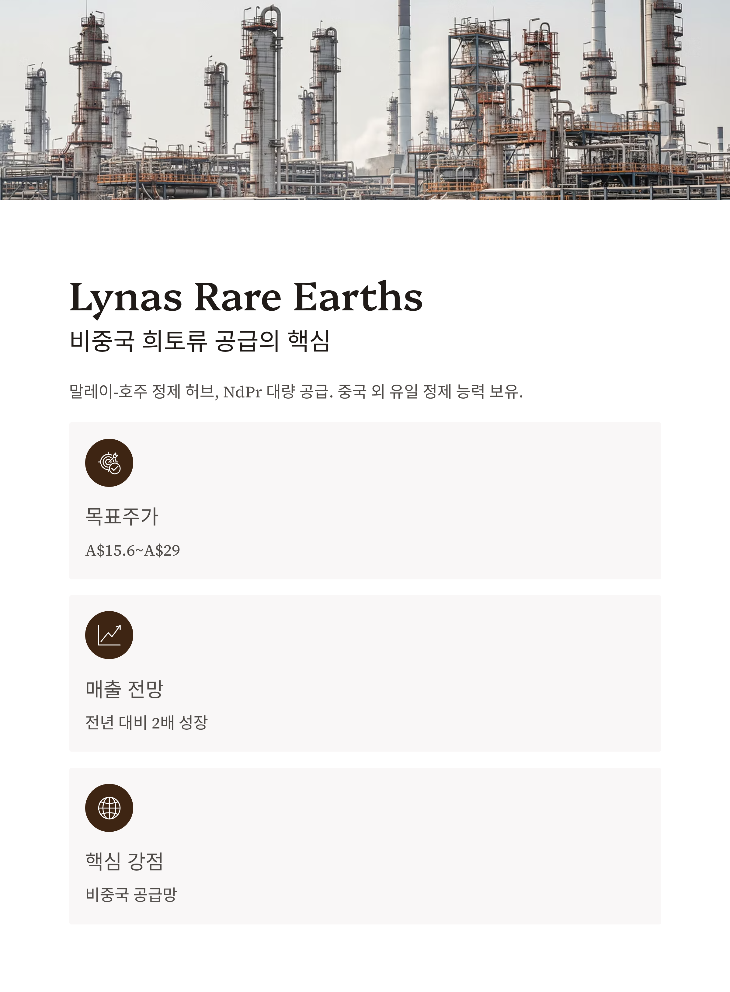 중국 외에서 유일하게 희토류 정제 능력을 갖춘 Lynas는 2026년 대규모 생산 확장과 NdPr 가격 회복이 겹치며 실적이 급증할 전망입니다. 특히 말레이시아와 호주 정제 시설의 안정 가동 여부가 주가 흐름에 큰 영향을 줍니다.