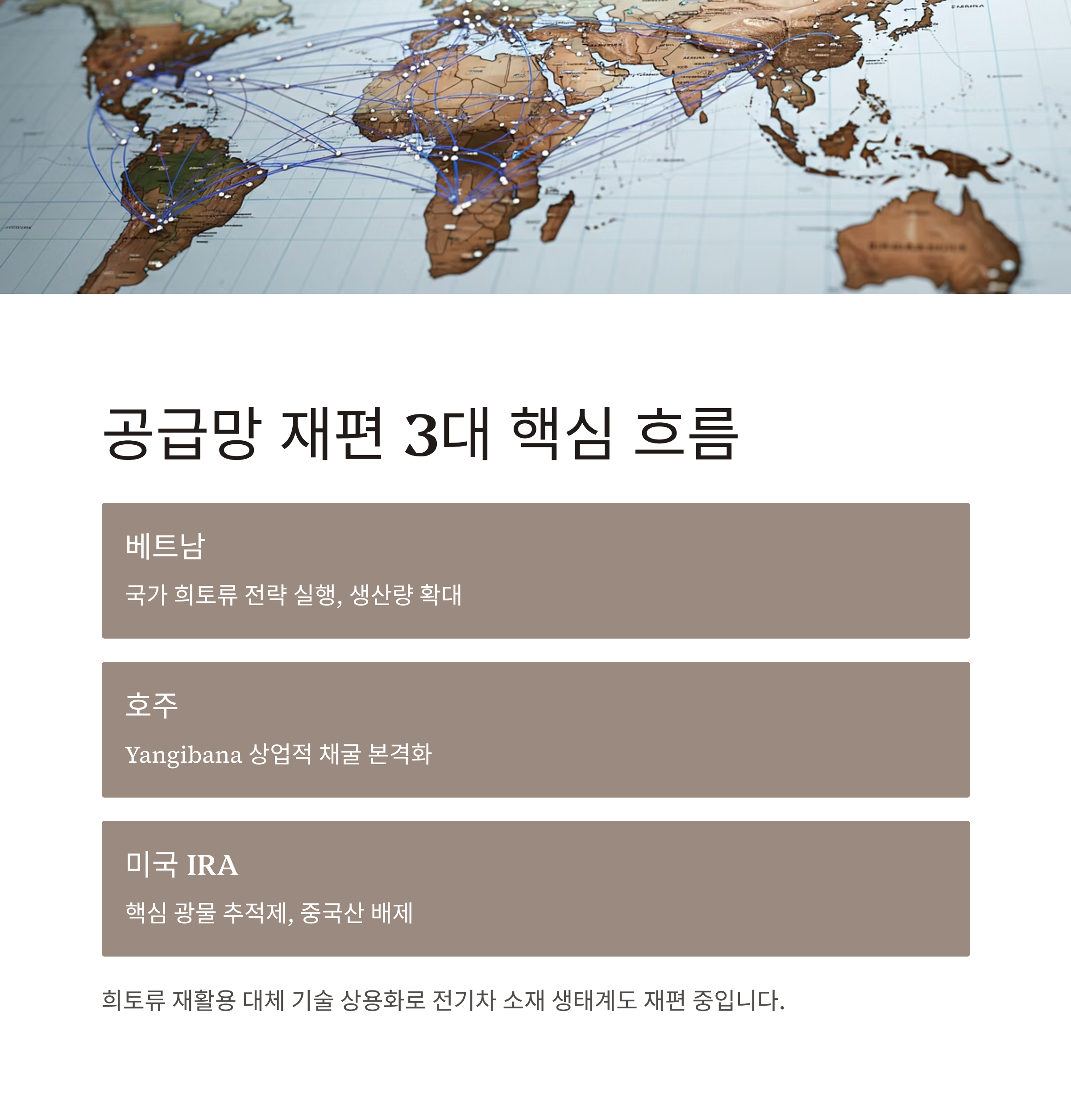 | 미국 IRA 규제 | 핵심 광물 추적제 도입, 중국산 희토류 배제 가속화 |