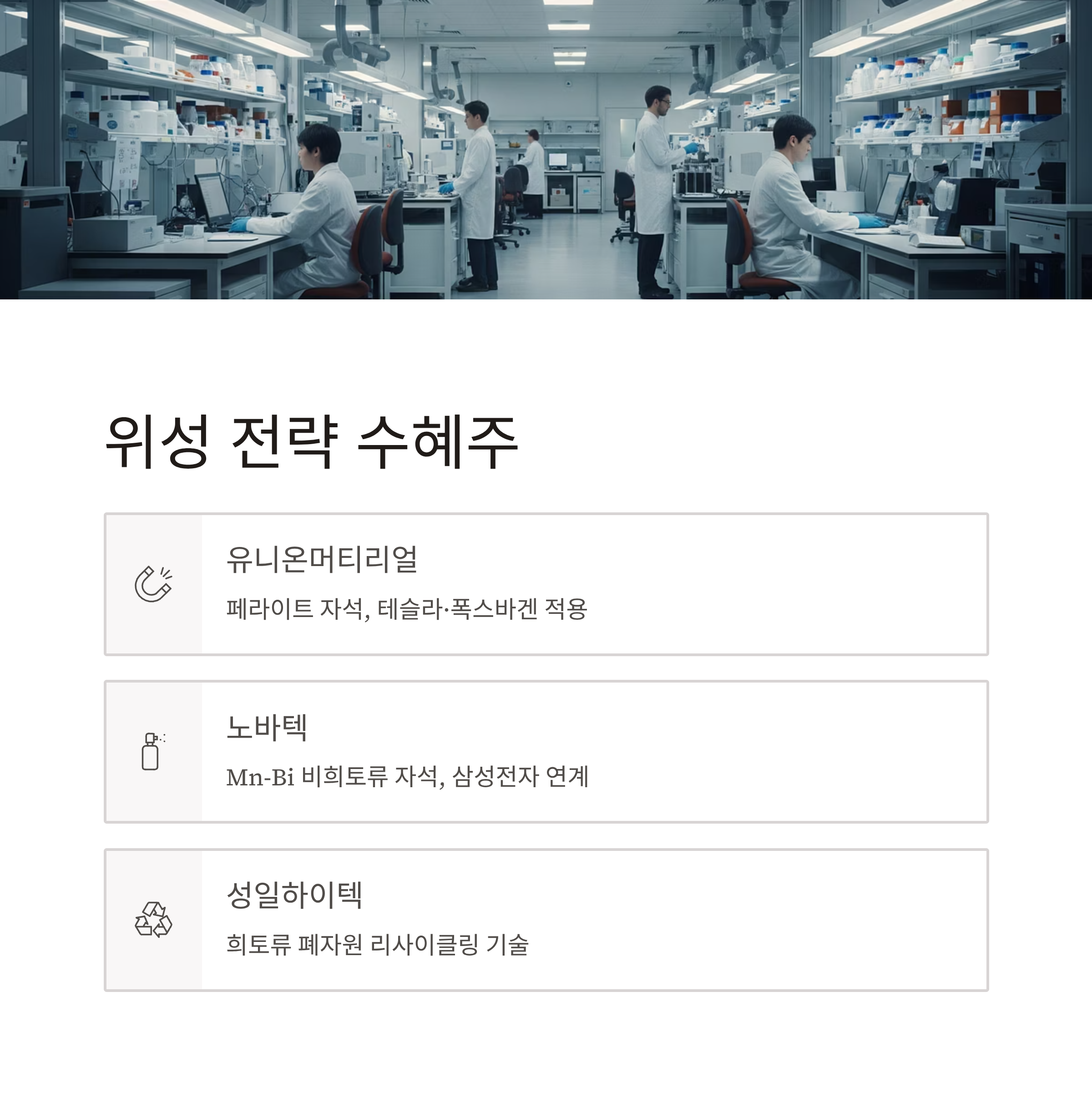 | 자석/소재 | 포스코인터, 노바텍 | 고부가가치 소재화 전략 |