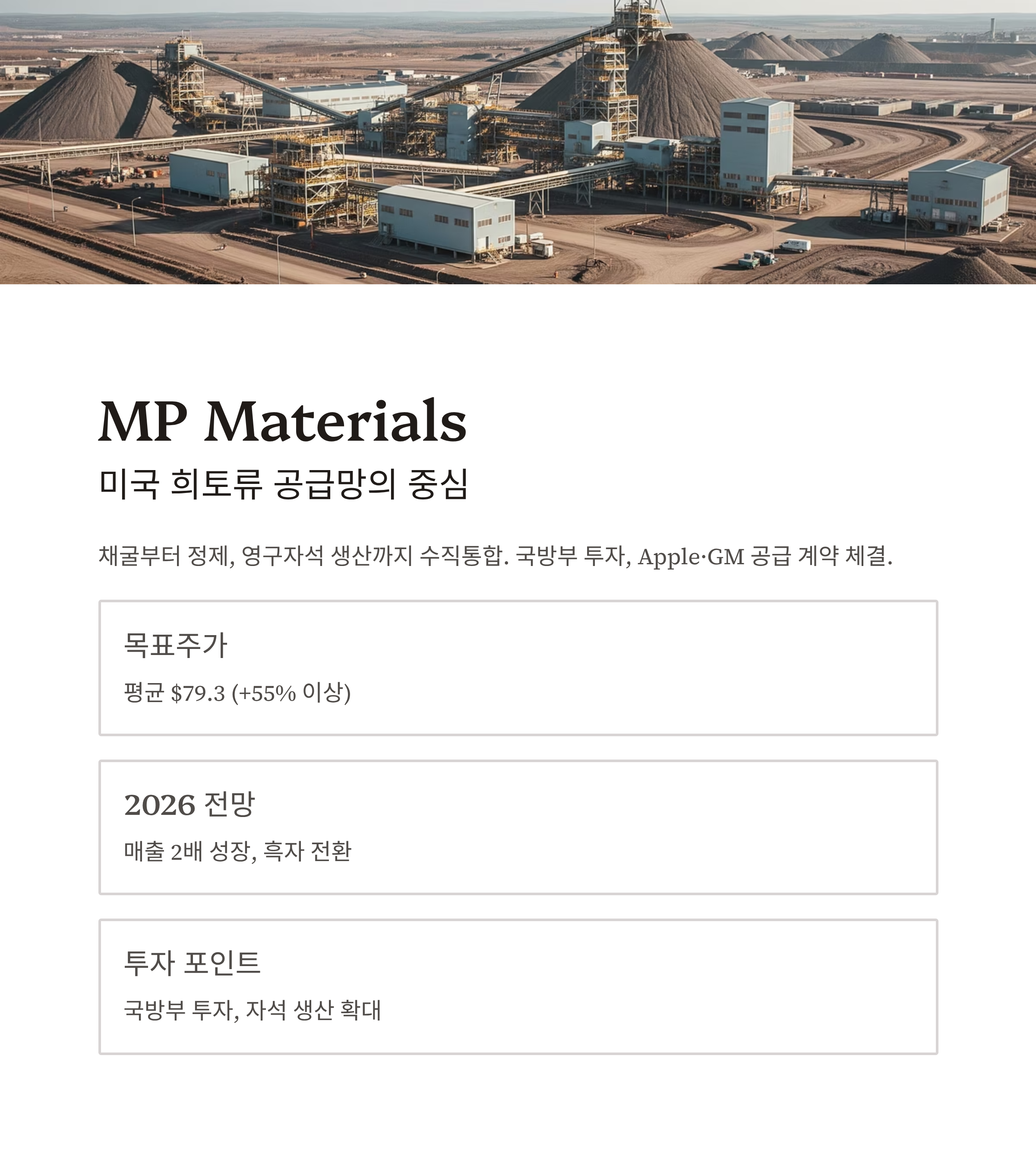 MP Materials는 채굴부터 정제, 영구자석 생산까지 공급망 전체를 구축하고 있습니다. 미국 국방부의 전략적 투자를 받았으며, Apple, GM 등과 공급 계약을 체결하고 있어 ‘안정 공급망의 대표주’로 부상했습니다.