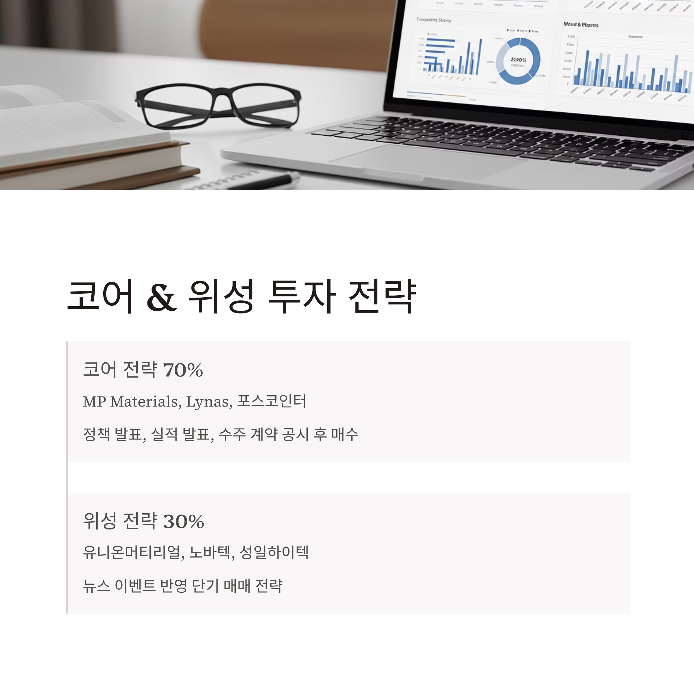| 코어(Core) | 약 70% | MP Materials, Lynas, 포스코인터내셔널 | 정책 발표, 실적 발표, 수주 계약 공시 후 매수 |