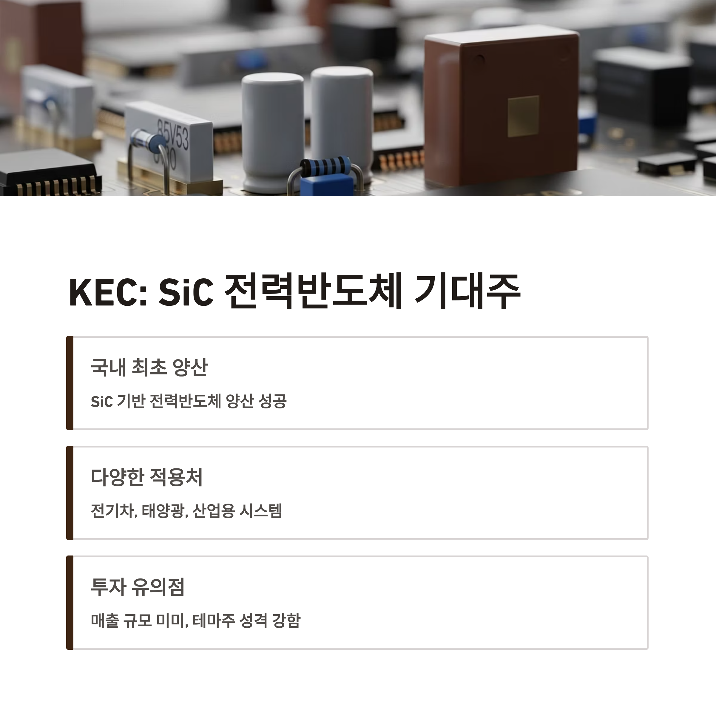 KEC는 국내에서 가장 먼저 SiC 기반의 전력반도체 양산에 성공했다고 보도된 바 있으며, 전력 제어용 TR, IC 소자를 중심으로 시장 점유를 노리고 있습니다. 전기차, 태양광 인버터, 산업용 전력 시스템에 적용될 수 있는 SiC 기술력과 더불어, “국산화 + 양산 성공”이라는 이슈는 투자자들의 기대를 모으는 데 충분했습니다.