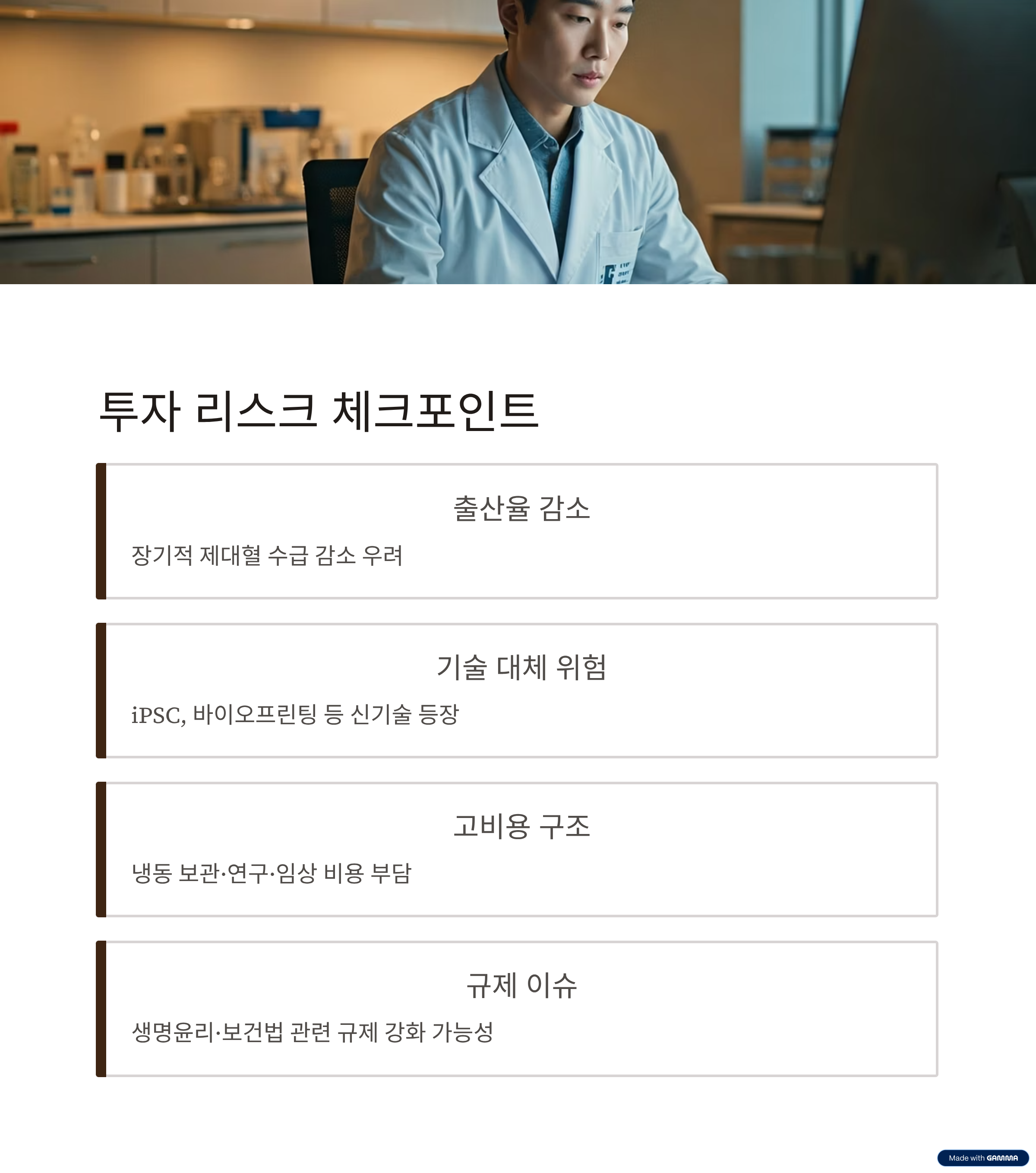 | 고비용 구조 | 냉동 보관·연구·임상 등 비용 부담 크고, 수익화까지 시간 소요 |