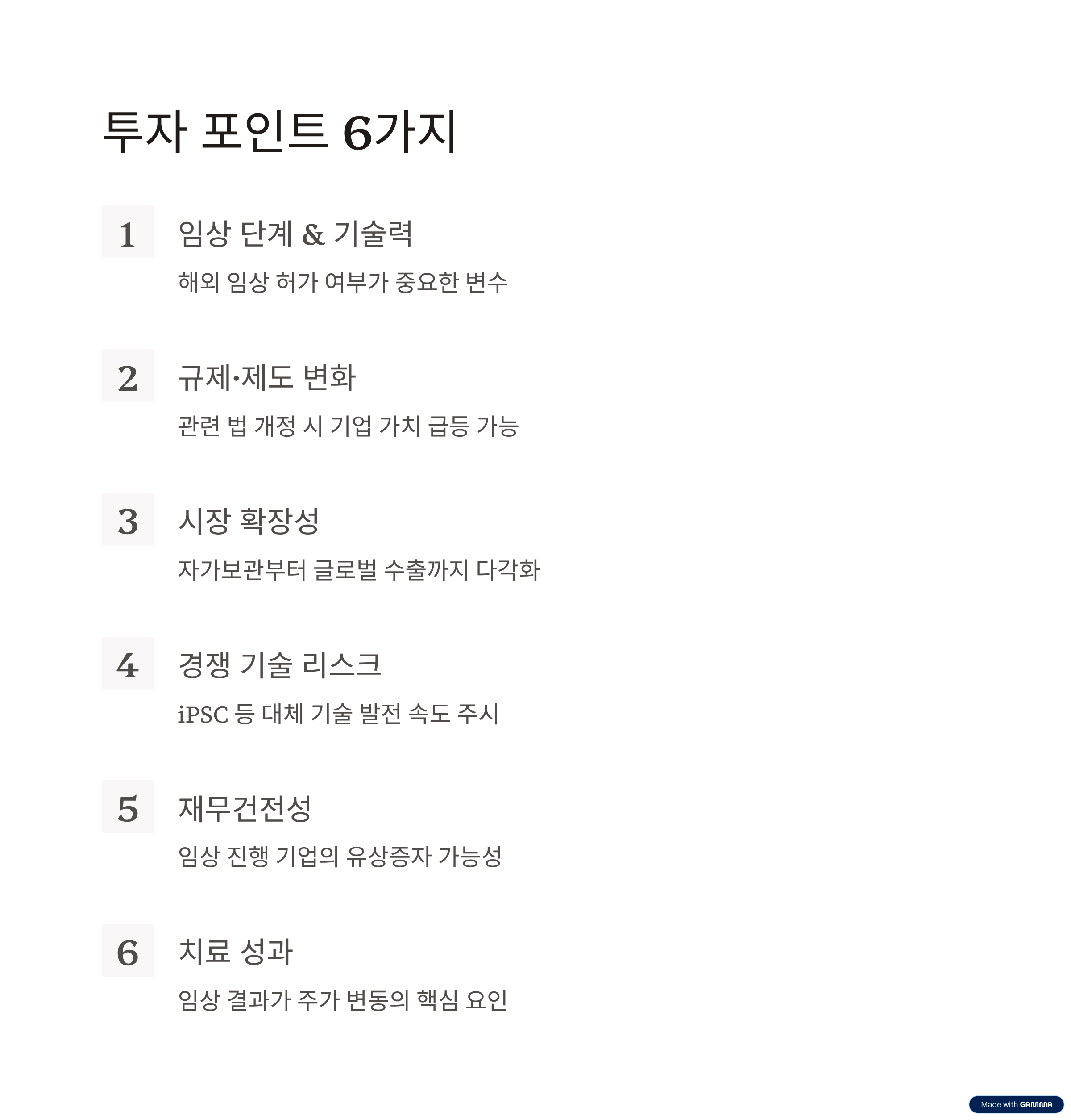 | 기술·치료 확대 | 암 치료 → 자가면역질환 → 유전질환 등 치료 범위 확장, 재생의료와의 융합도 빠르게 진행 중 |
