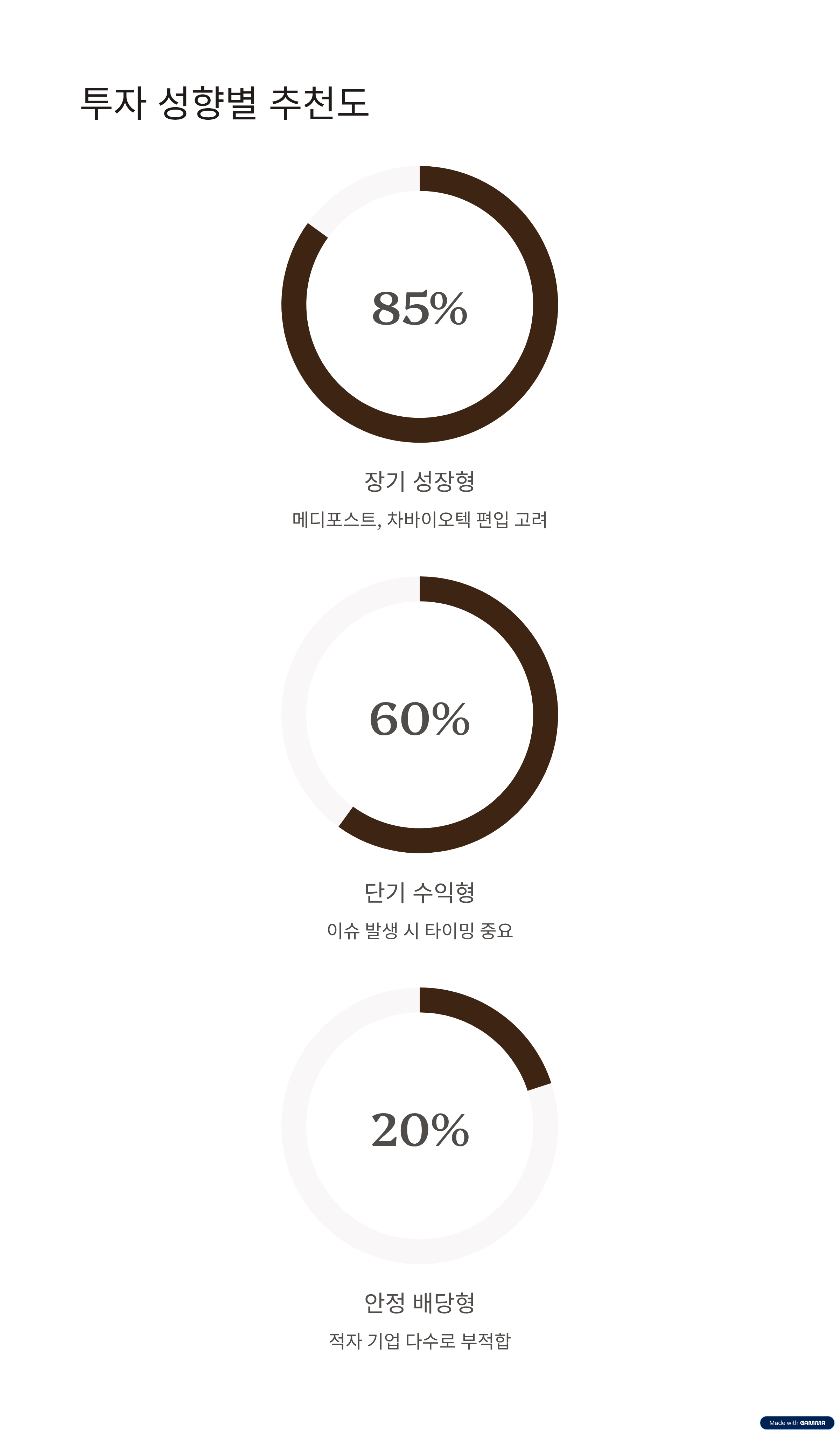 | 장기 성장형 포트폴리오 편입 | ✅ 메디포스트, 차바이오텍 등 성장성 높은 종목 중심으로 편입 고려 가능 |