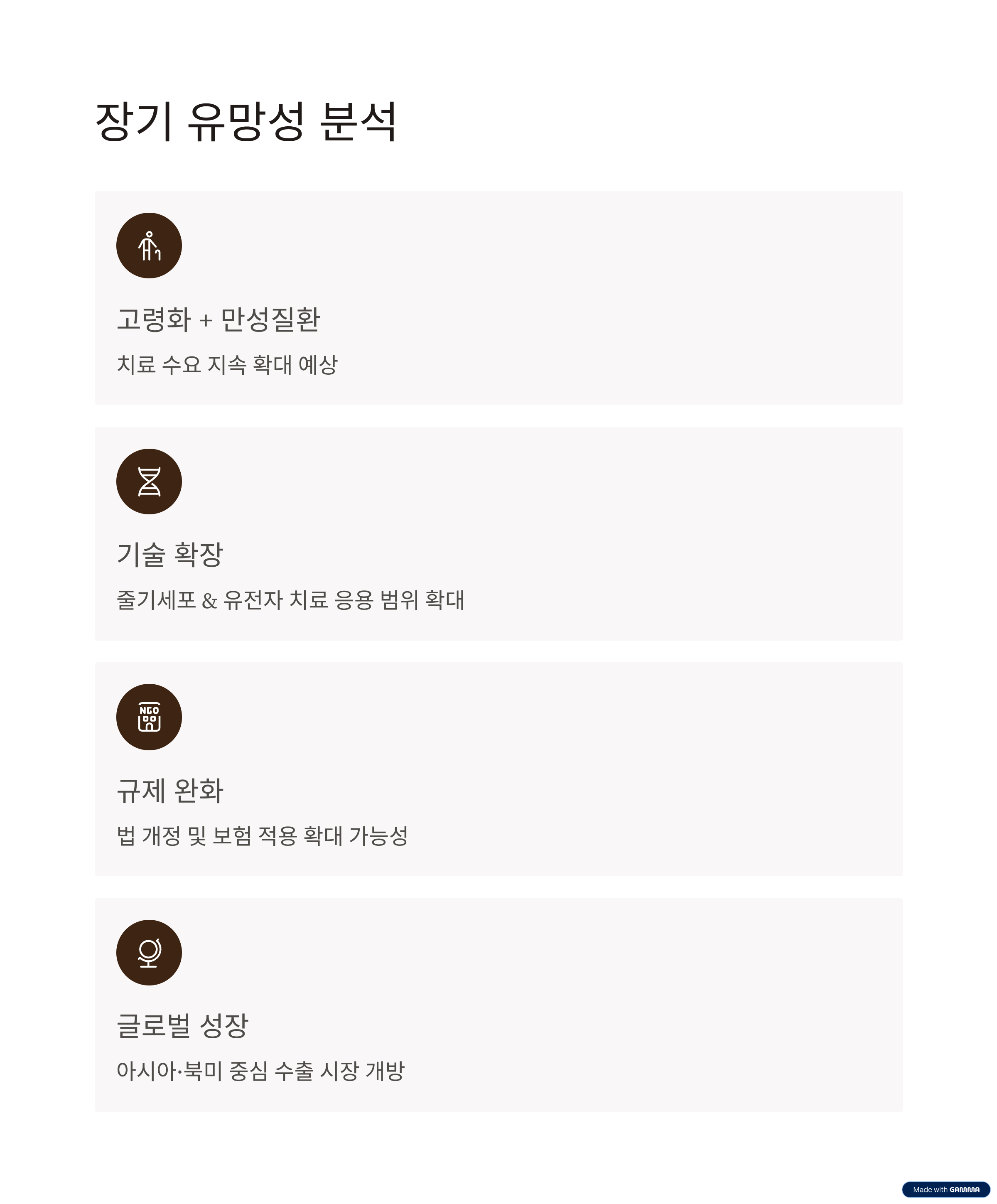 - 자가보관 + 병원 협업 + 글로벌 제대혈 수출 시장까지 다각화될 수 있음