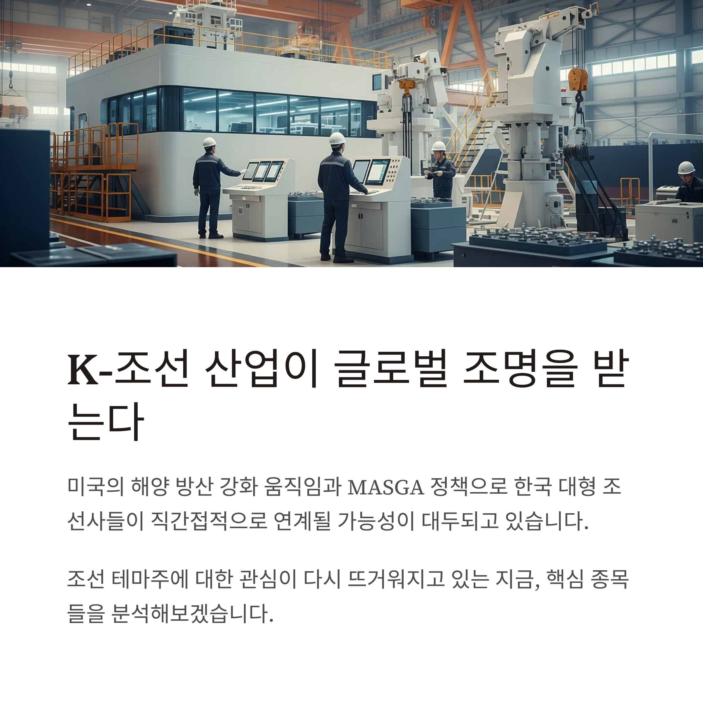 K-조선 중심 산업 구조 특성상 대부분 국내 기업에 집중하는 게 일반적이지만, MASGA 정책이 본격화되면 미국 방산/해양 인프라 기업 또는 한국 조선사의 미국법인, 공급망 파트너들도 주목 대상이 될 수 있습니다.