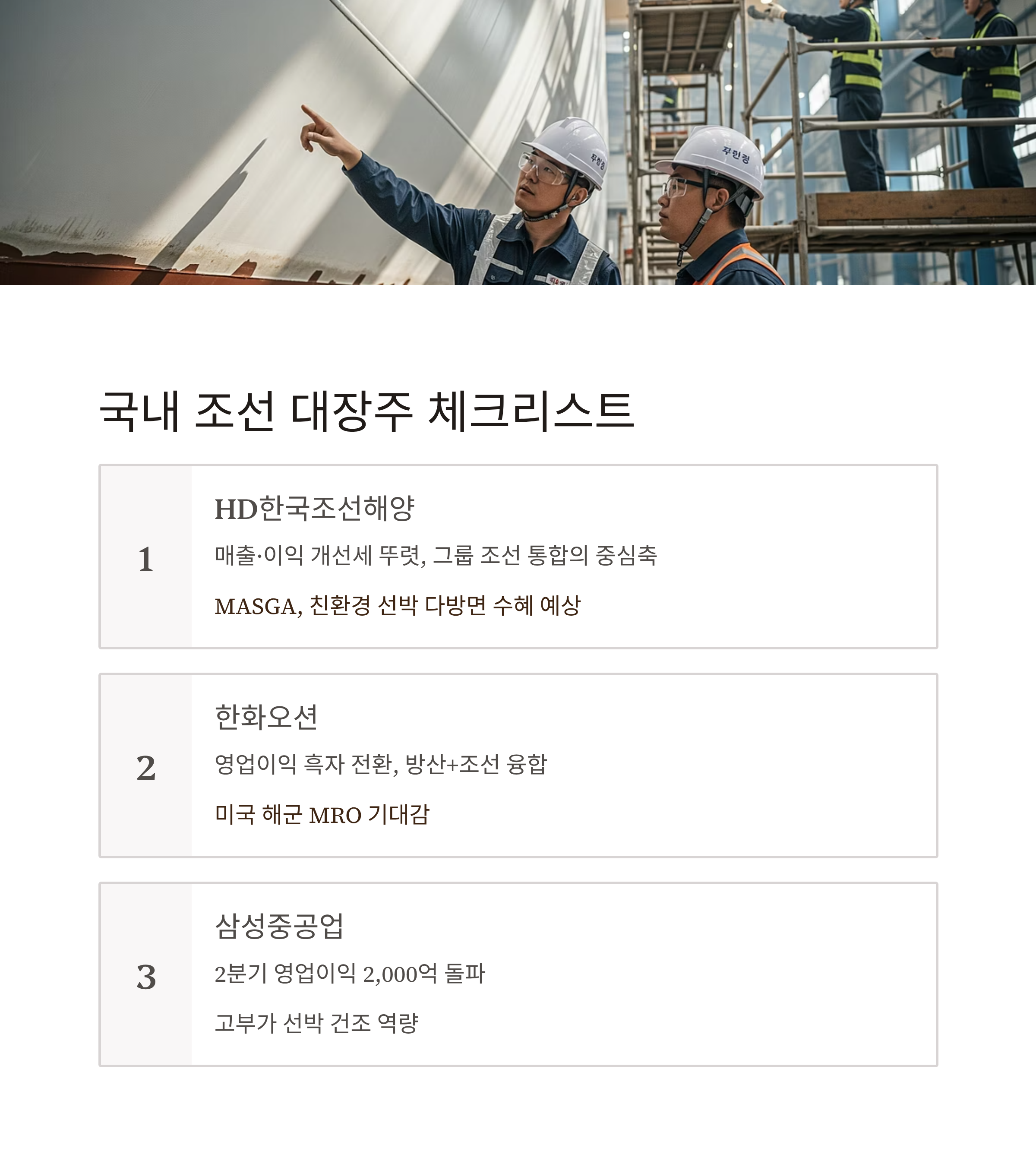 | 삼성중공업 | 2분기 영업이익 2,000억 돌파, 수익성 회복세 | 고부가 선박 건조 역량, 해양플랜트 수주 경쟁력 | 수주 실적 기복, 경쟁 심화 |