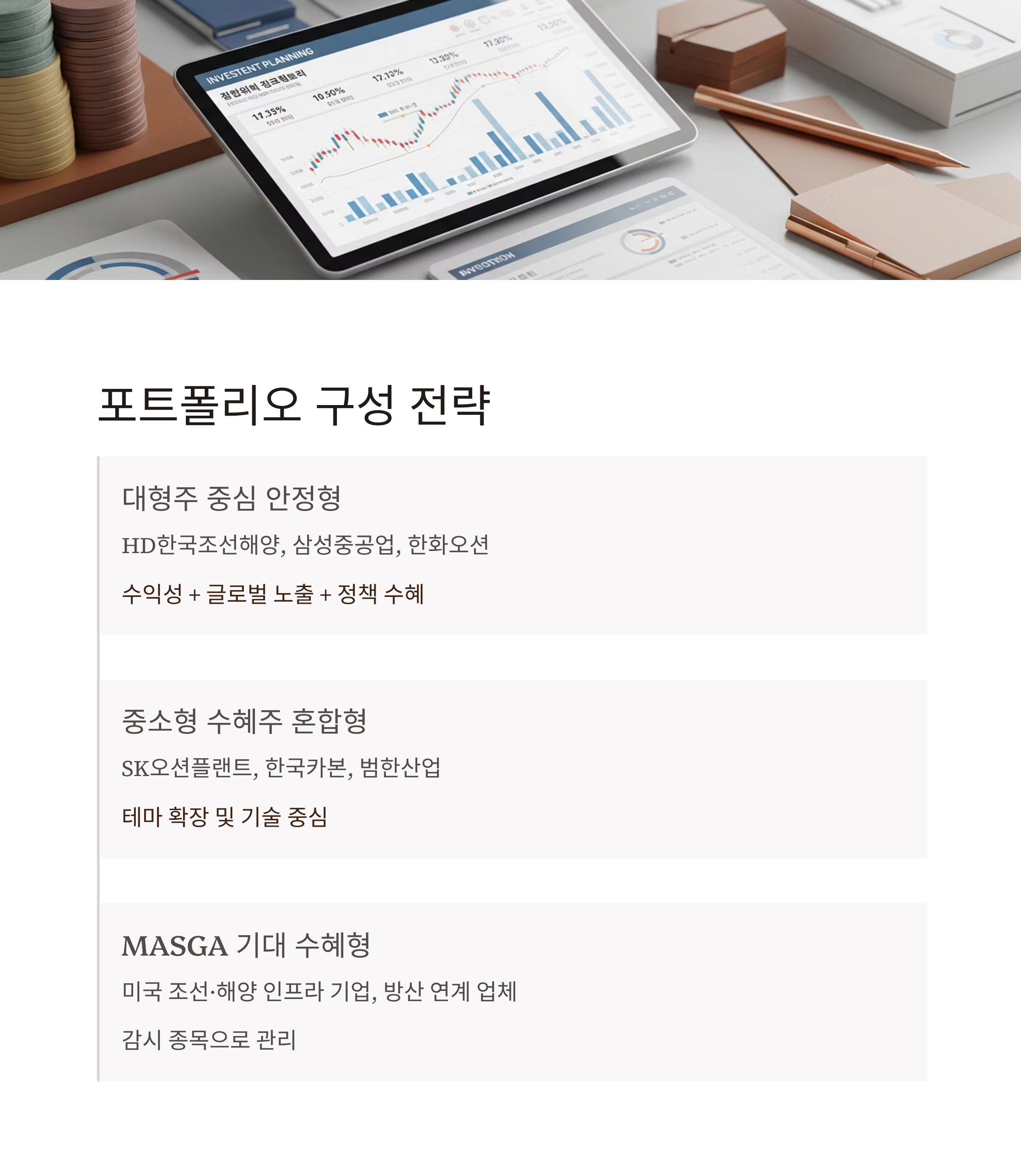안전하게 접근하시려면 대형주 중심 + 중소형 테마주 소량 스파이스 구성 전략이 가장 현실적일 수 있어요.