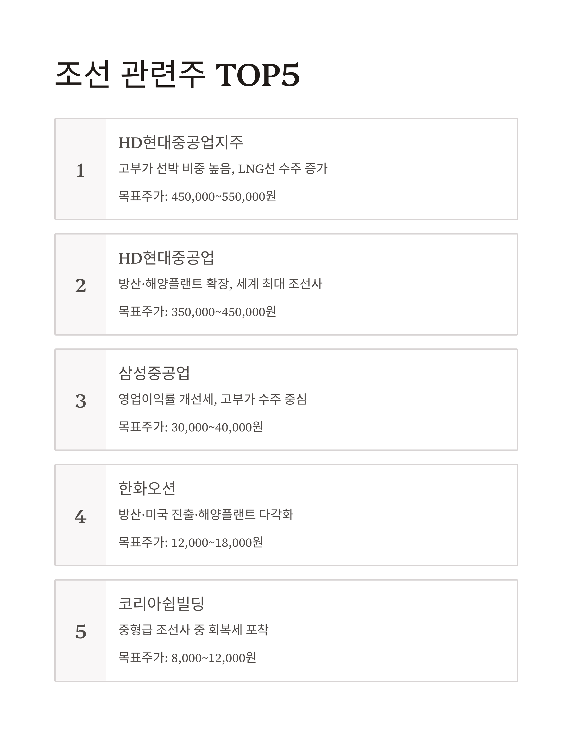 | HD현대중공업지주 (009540) | 고부가 선박 비중 높고, LNG선 수주 증가 추세 | 납기 지연, 원자재 가격 상승 | 450,000 ~ 550,000원 |