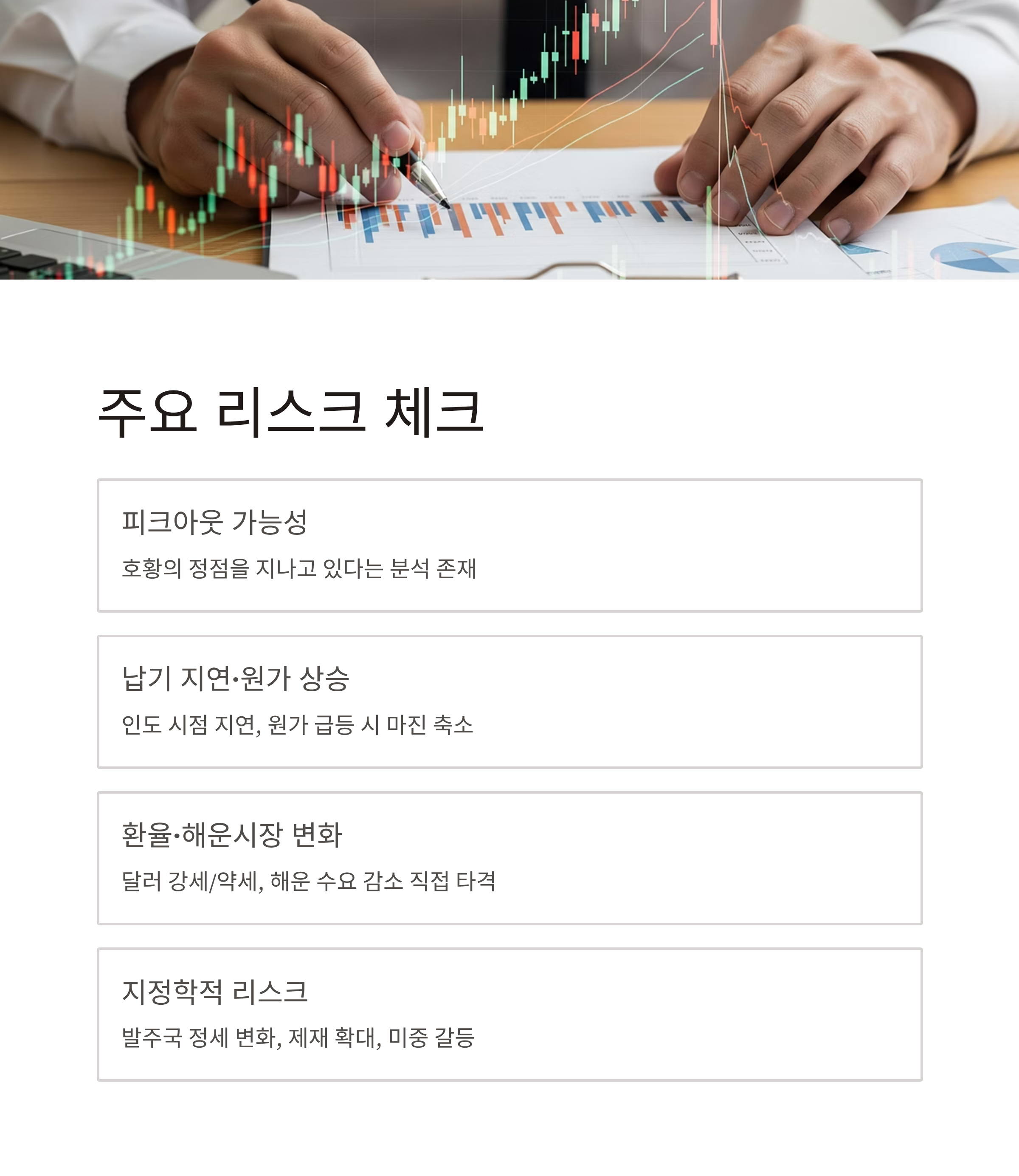 → 이미 호황의 정점을 지나고 있는 것 아니냐는 분석도 나옵니다. - 납기 지연 및 원가 상승