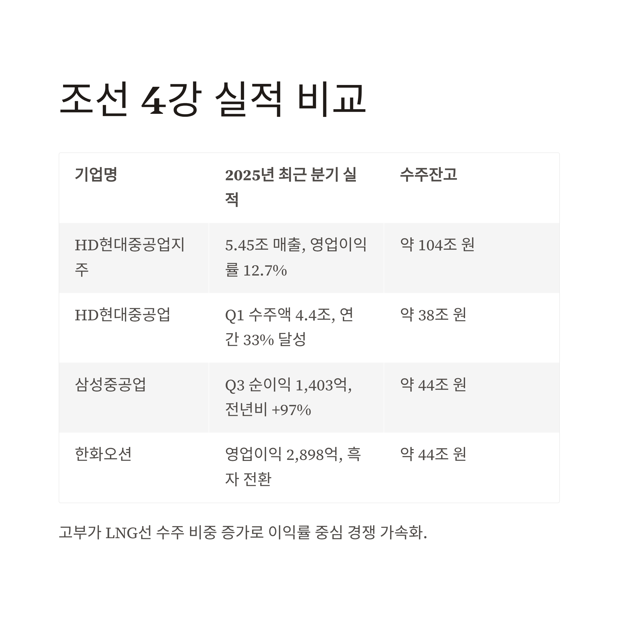 → 전체적으로 고부가 LNG선 수주 비중이 커지면서 이익률 중심의 경쟁이 가속화되고 있는 것이 현재 흐름입니다.