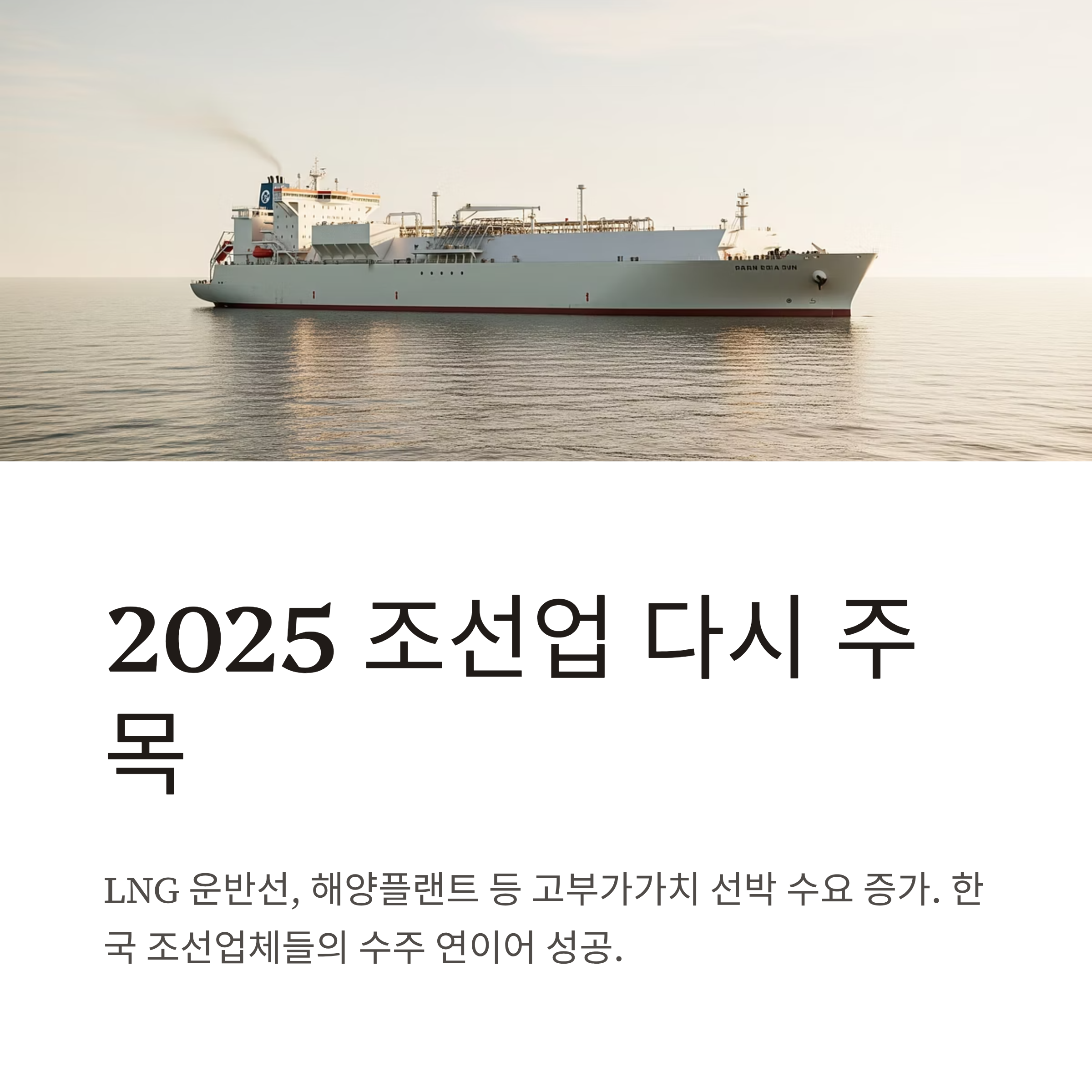 2025년 들어 조선업이 다시 주목받고 있습니다. LNG 운반선, 해양플랜트 등 고부가가치 선박 수요가 증가하고, 글로벌 지정학적 흐름과 맞물려 한국 조선업체들의 수주가 연이어 성공하고 있죠.