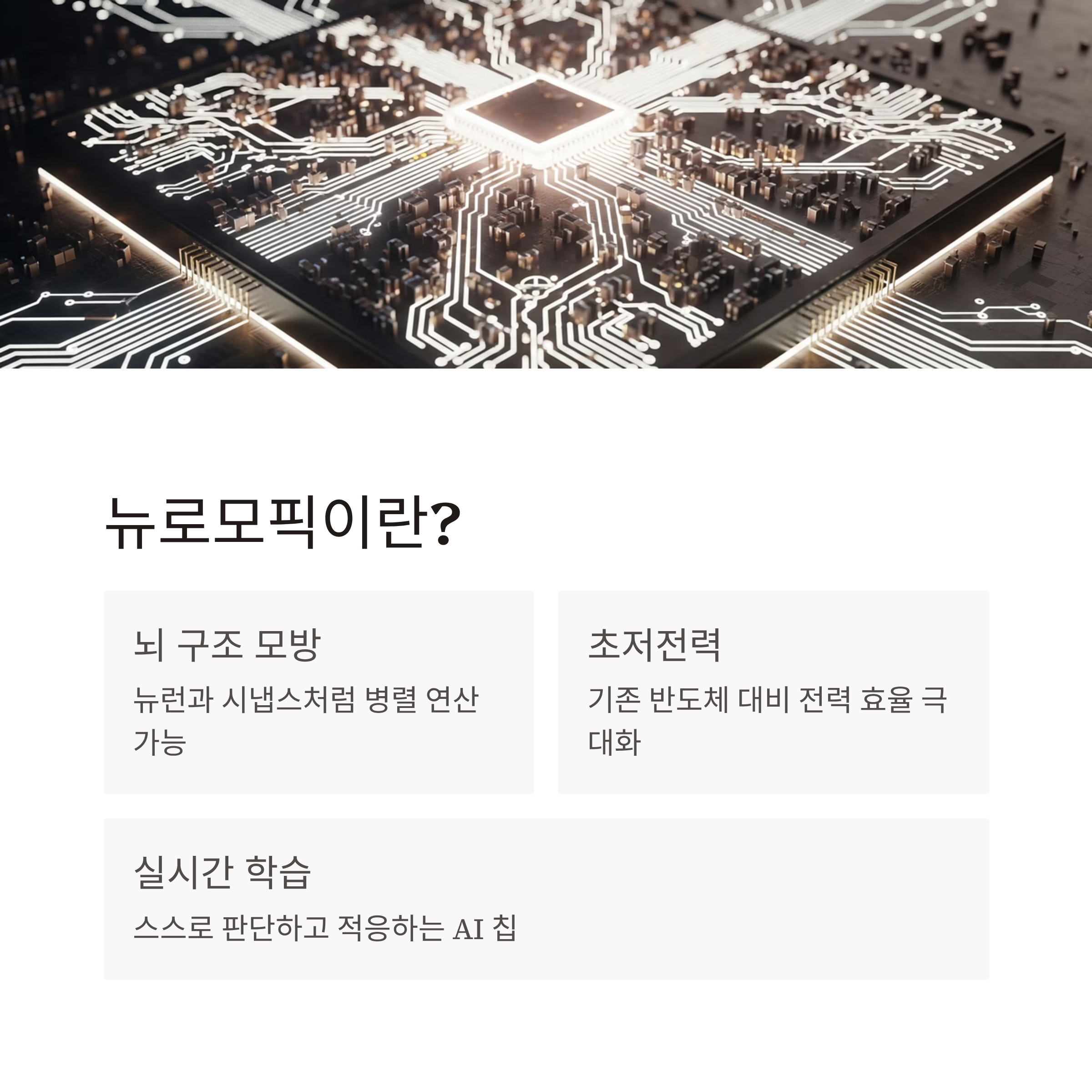 | 연산 방식 | 뉴런/시냅스 유사 병렬 구조 | 자율주행, 로봇 AI |