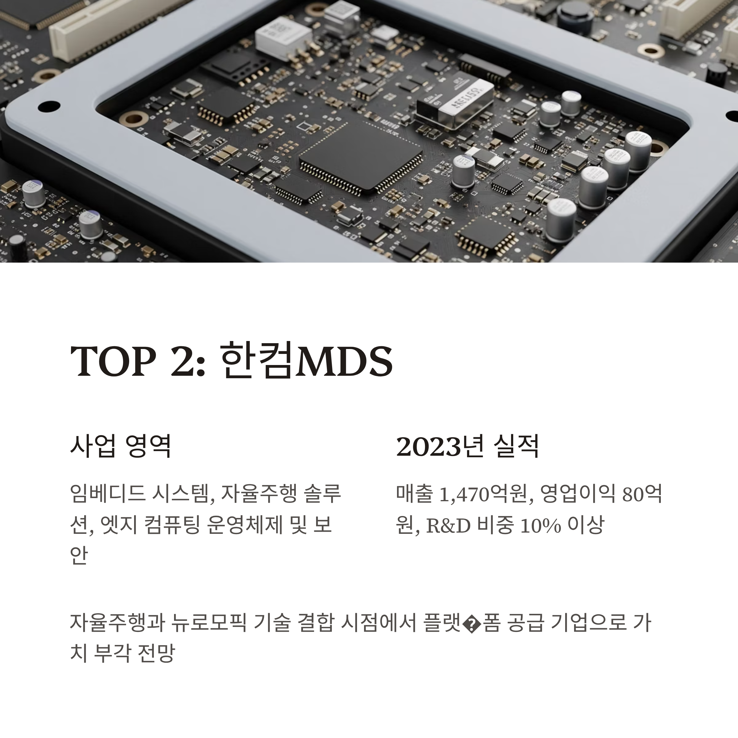 임베디드 시스템과 자율주행 솔루션을 제공하는 기업으로, 뉴로모픽 기술이 적용되는 엣지 컴퓨팅·로봇 산업에 필수적인 운영체제와 보안 솔루션 역량을 보유하고 있습니다.