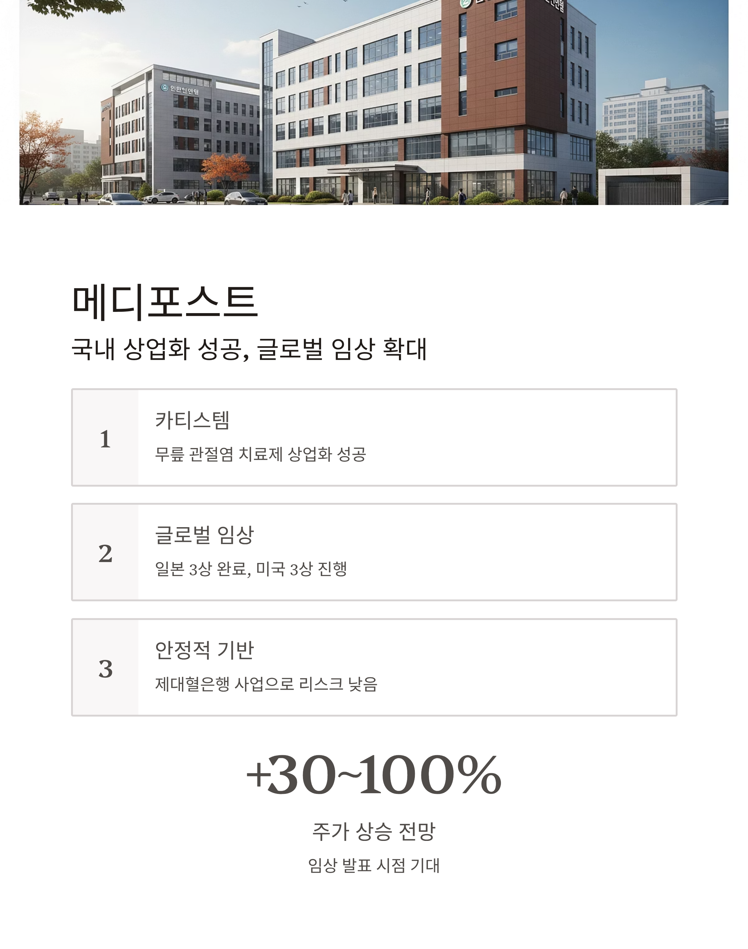 | 메디포스트 | 일본/미국 3상 | 국내 상업화 | 카티스템 | 글로벌 진출 시 강한 재평가 가능 |