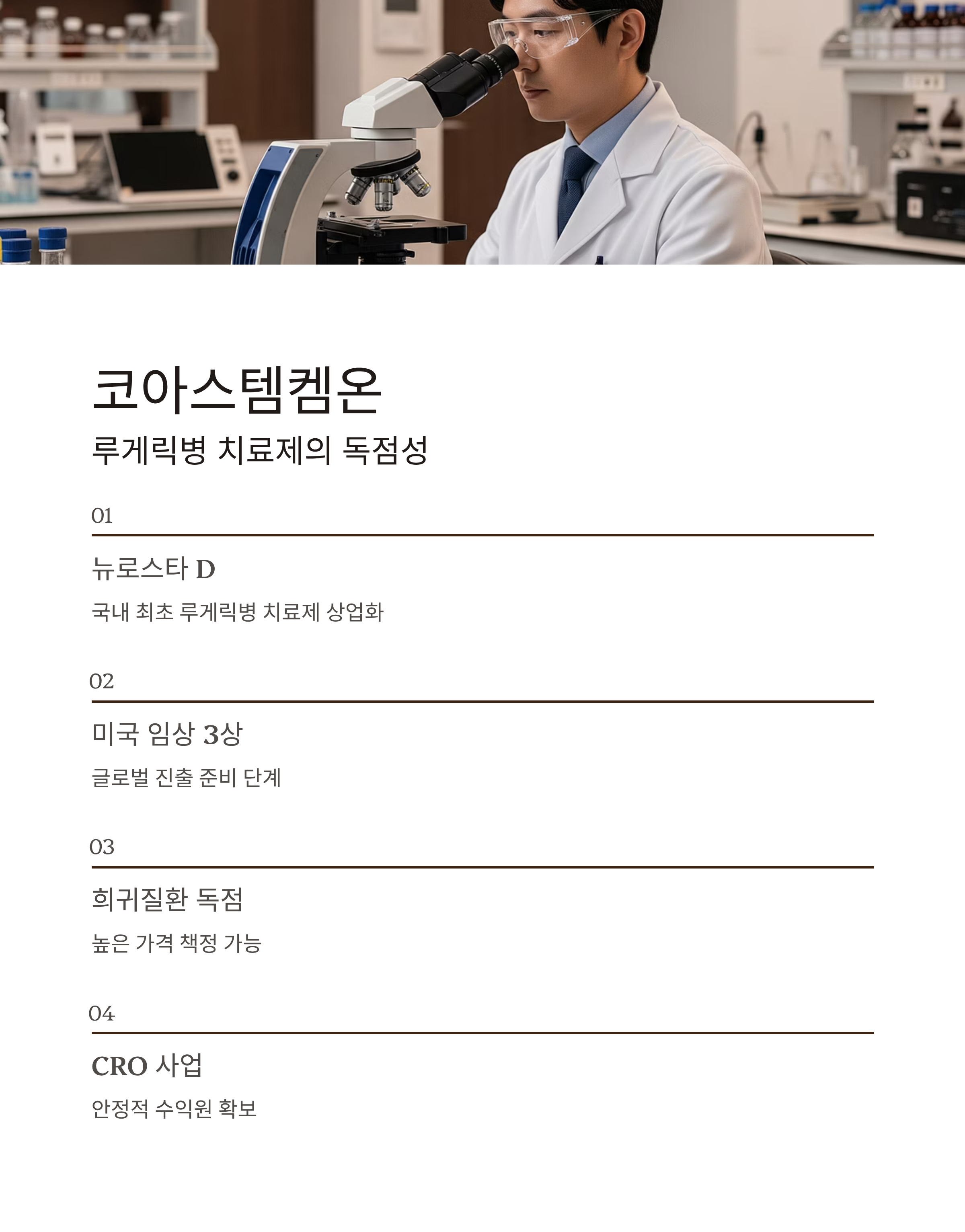 | 코아스템켐온 | 미국 3상 준비 | 국내 상업화 | 뉴로스타 D | 글로벌 승인 시 희귀약 가치 상승 |