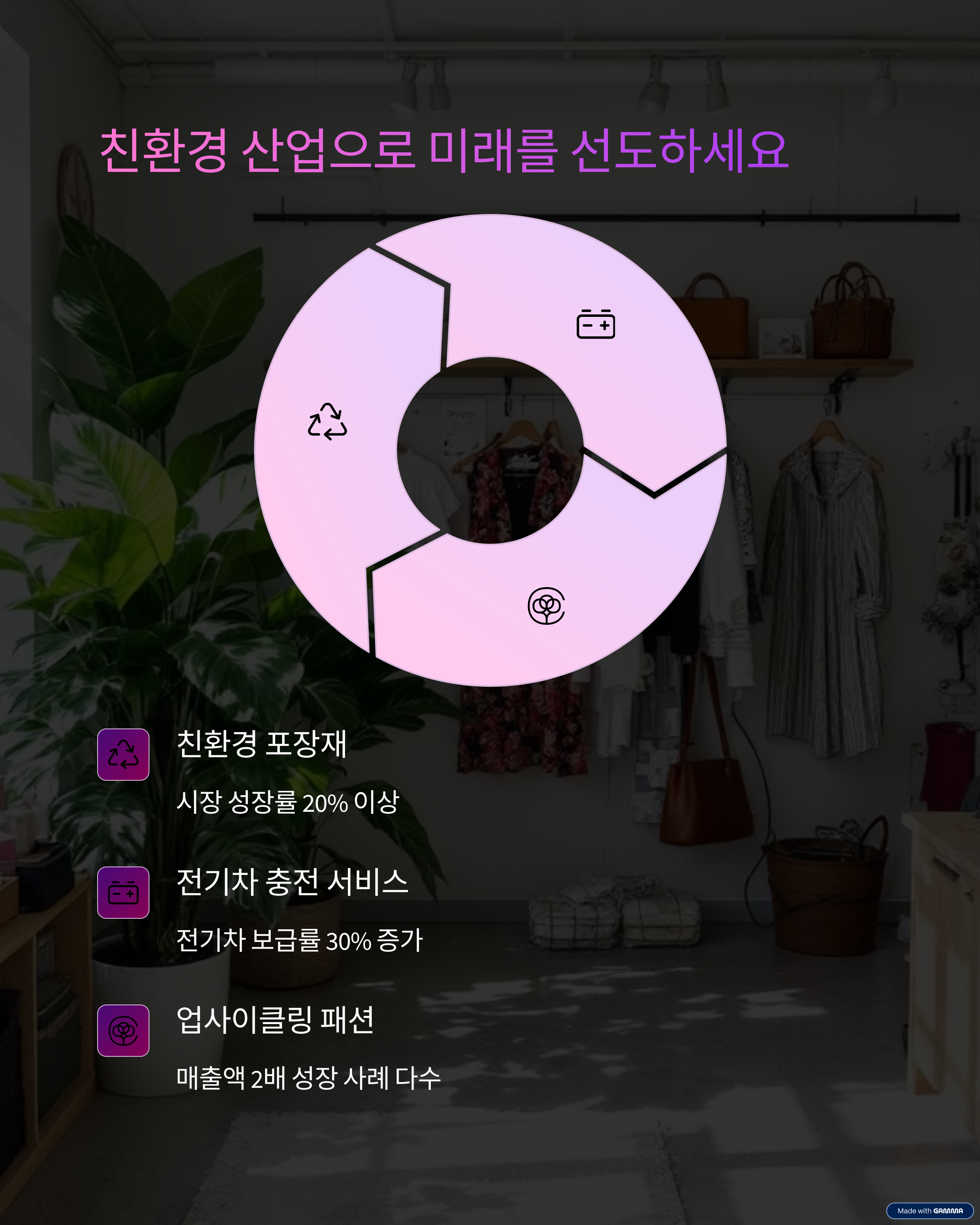 | 자동화 솔루션, AI 콘텐츠 생성 | 친환경 제조업, 태양광 발전 | 건강 관리 앱, 웨어러블 디바이스 |