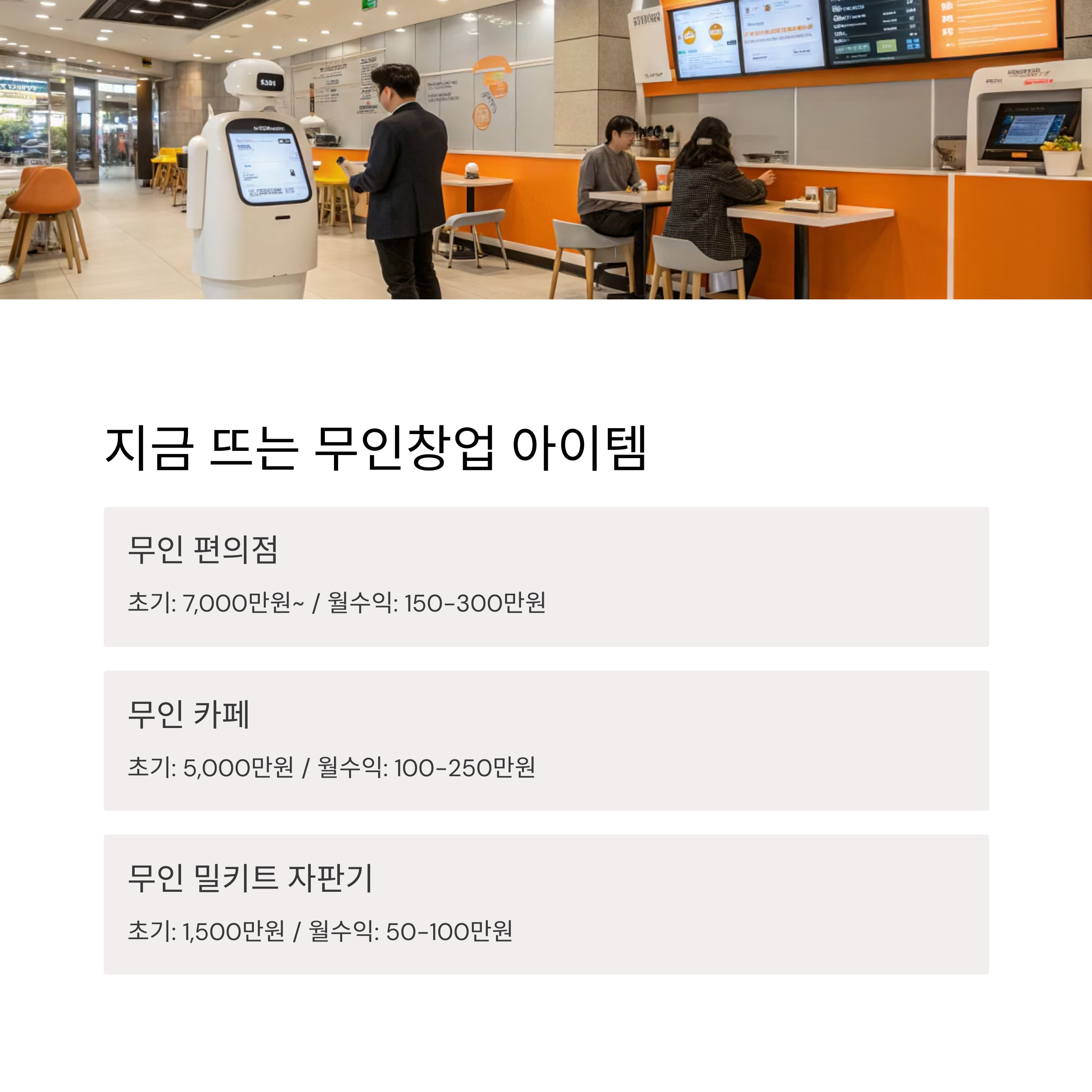 | 무인 편의점 | 24시간 운영, 스마트게이트 출입 | 7,000만 원~ | 150~300만 원 |