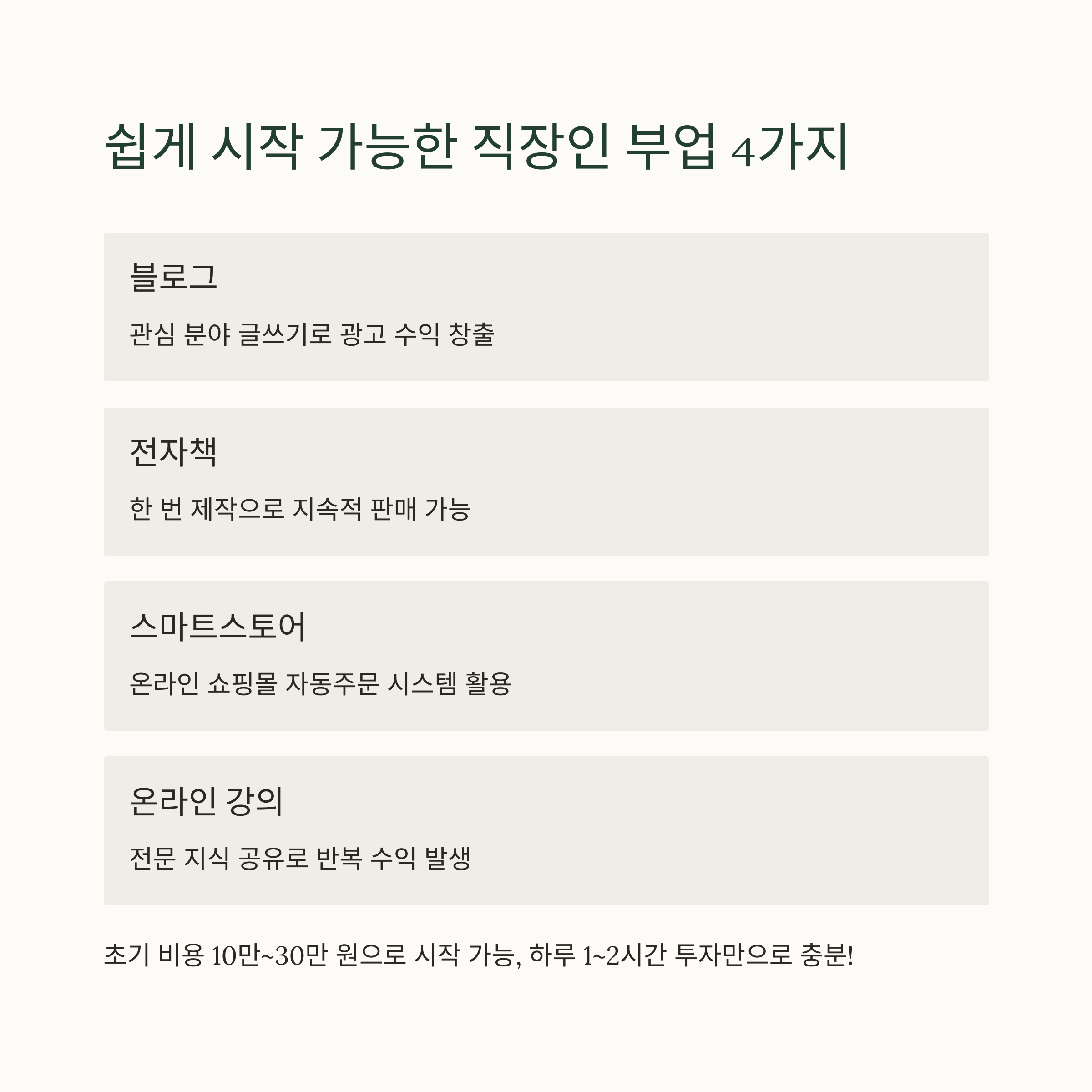 | 블로그, 전자책, 자동메일 시퀀스 | 스마트스토어, 디지털 굿즈 판매 | 퇴근 후 2시간 부업 가능 |