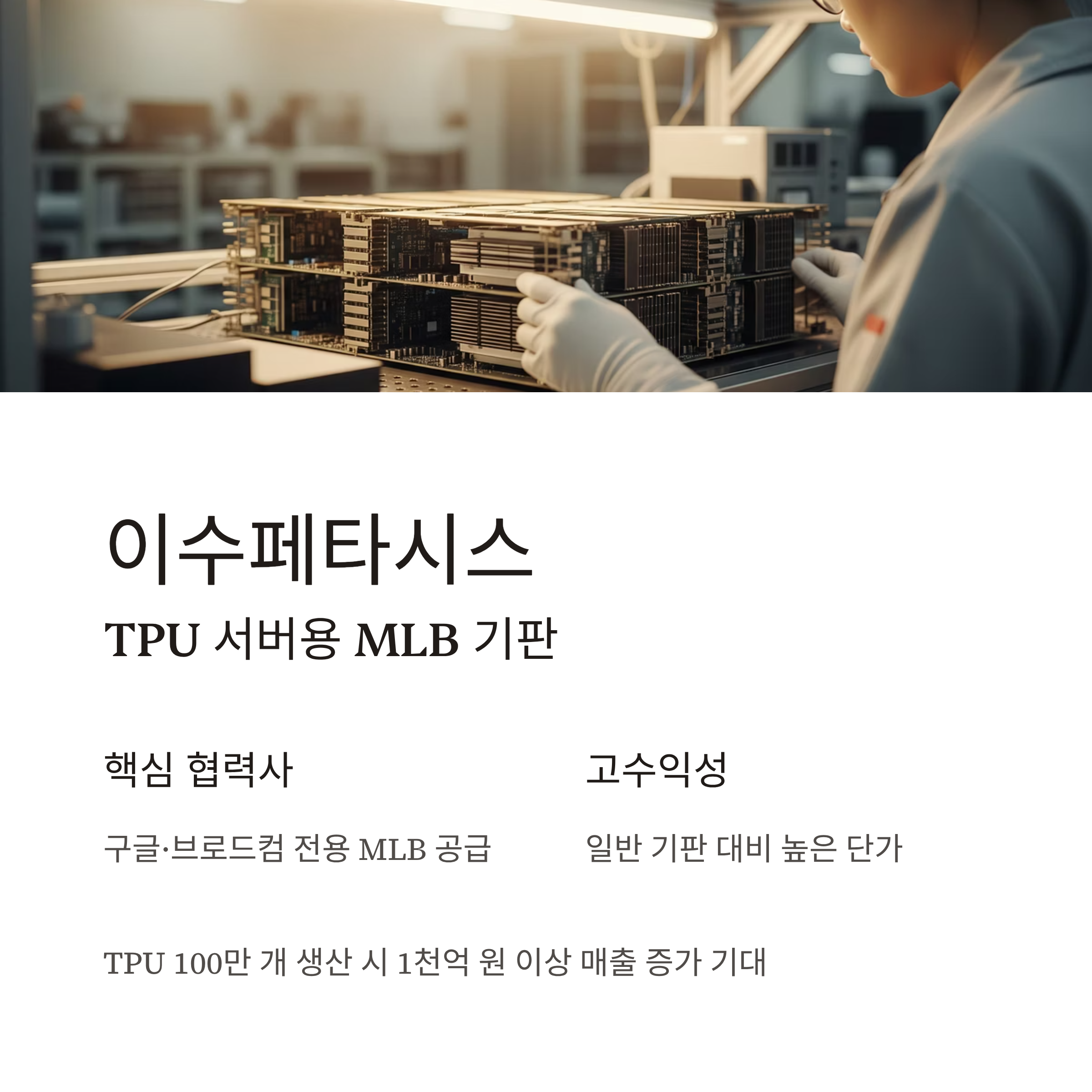 | 이수페타시스 | TPU 서버 MLB 기판 납품 | 구글·브로드컴향 공급, 단가·수익성↑ |