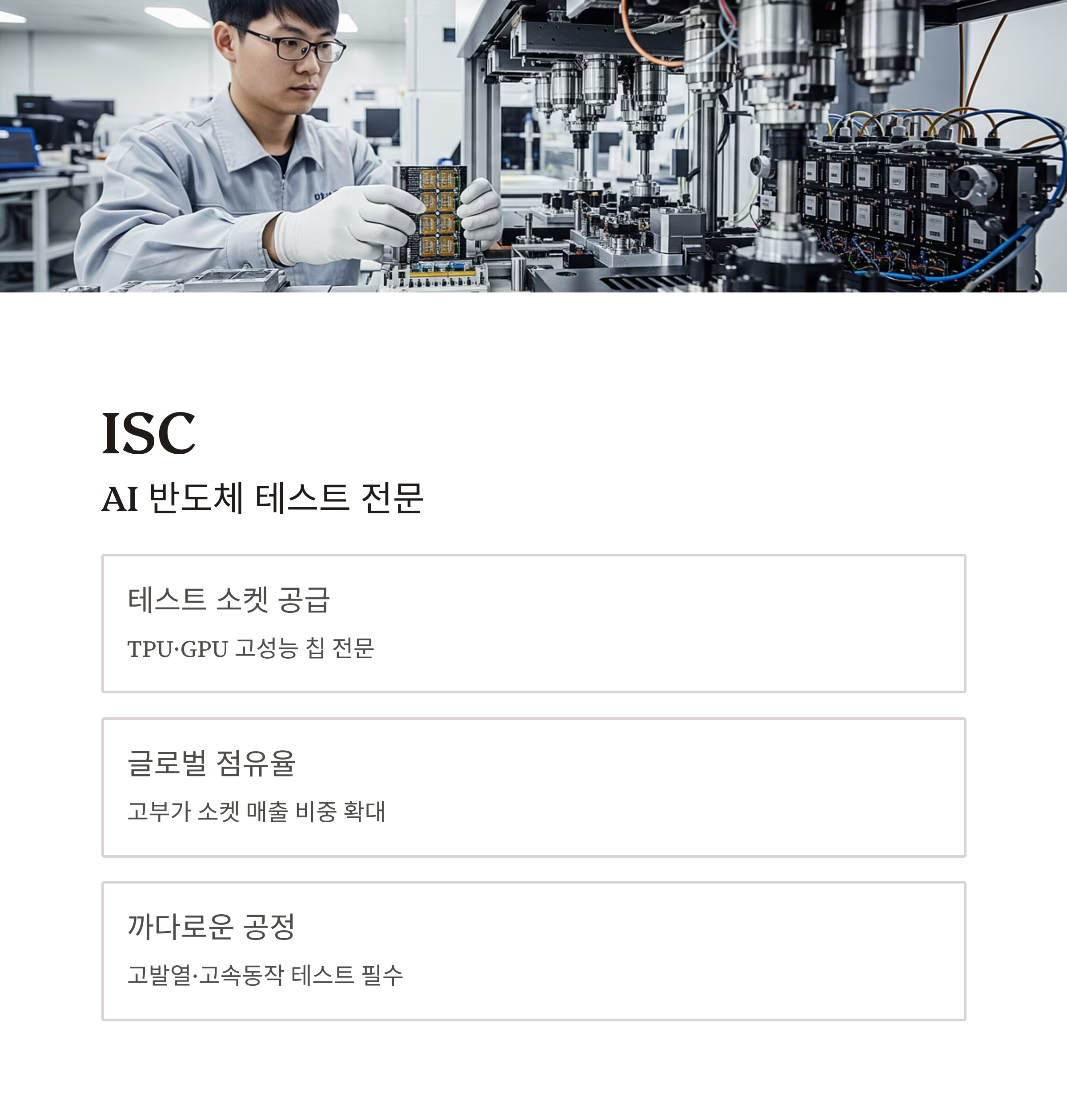 | ISC | AI 칩 테스트 소켓 전문 | TPU·GPU 테스트 수요 증가 대응 |