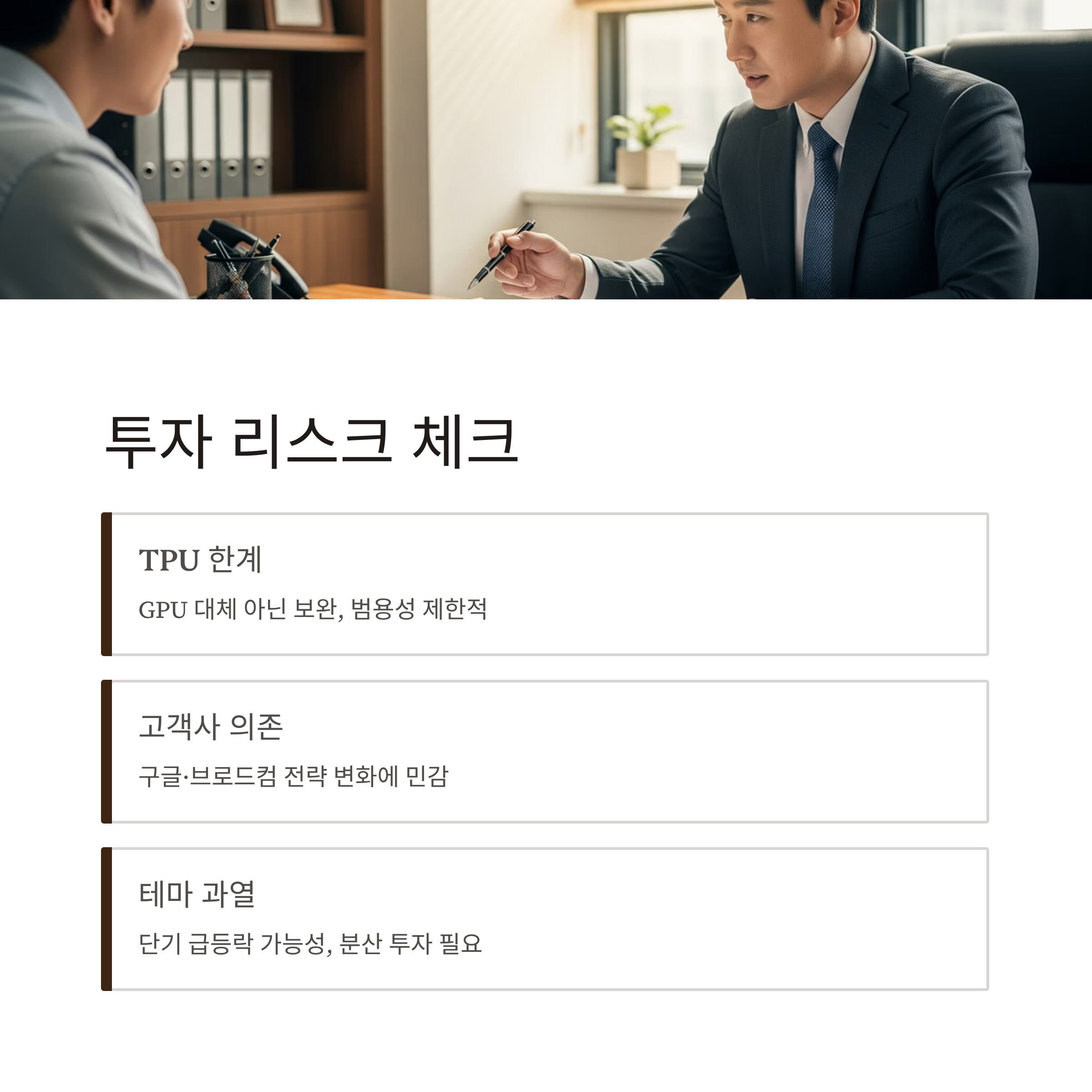 시장에는 언제나 반대편 리스크도 존재합니다. TPU 관련주 투자 시 주의할 점은 다음과 같습니다.