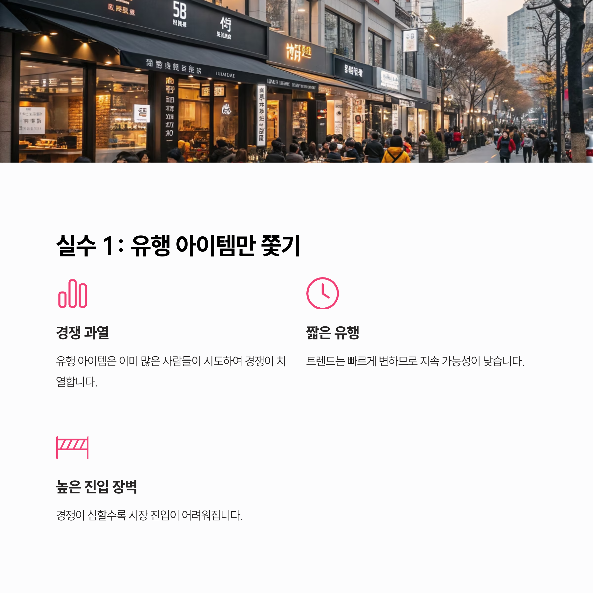 두 번째 실수는 ‘단기 유행 아이템 추종’입니다. 갑자기 떠오른 트렌드 아이템은 진입 장벽이 낮은 대신 경쟁이 매우 치열합니다. 예를 들어 특정 다이어트 식품, 뷰티 디바이스, 인테리어 소품 등이 갑자기 유행하면 누구나 쉽게 뛰어들 수 있어 광고 단가와 클릭 경쟁이 과열됩니다. 이 경우 대형 셀러가 광고 예산을 밀어붙이는 상황에서 소자본 창업자가 생존하기 어렵습니다. 트렌드 아이템이더라도, 해당 시장을 경험하고 유통 루트가 있다면 가능하지만 그렇지 않다면 유행이 꺼지면 곧바로 재고와 손실이 쌓이게 됩니다.