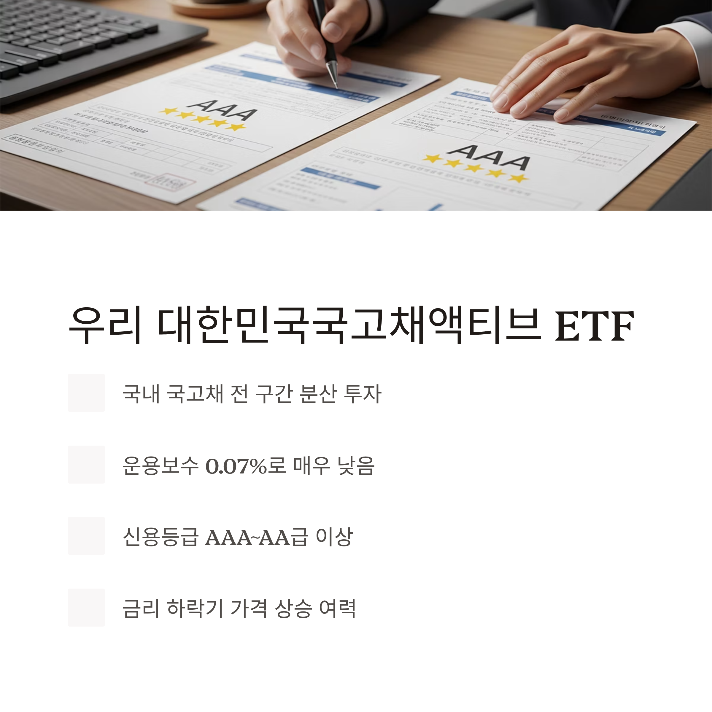 우리 대한민국국고채액티브 ETF (426150) 추정 2% 내외 국내 국채 중심. 신용등급 AA 이상, 운용보수 매우 낮음 금리 리스크 외에는 안정성 높음