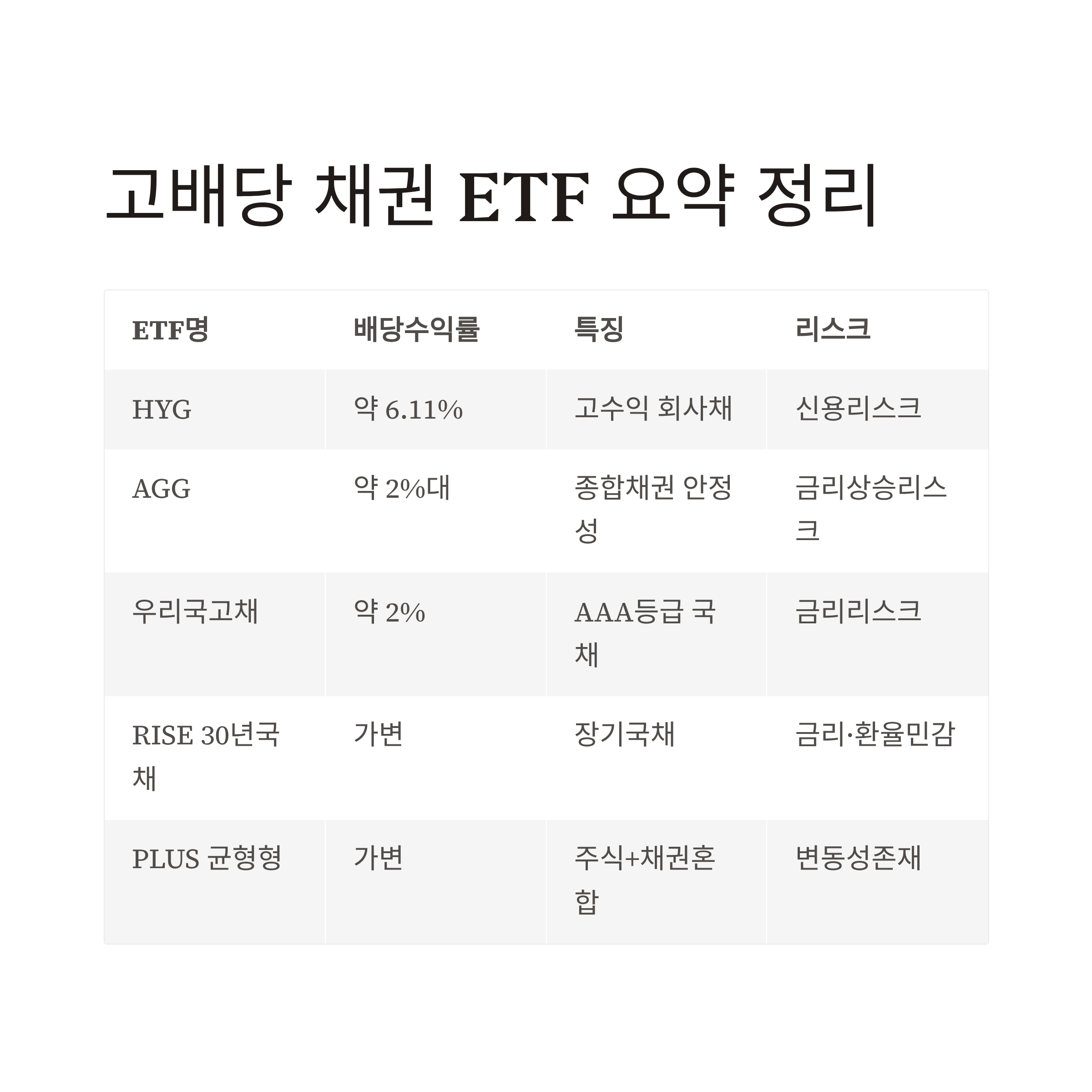 안정성과 수익을 균형 있게 고려하고 싶다면 국고채형 ETF를 기본 축으로 삼고, HYG 같은 고배당 ETF를 보완재로 분산하는 전략을 추천드립니다.