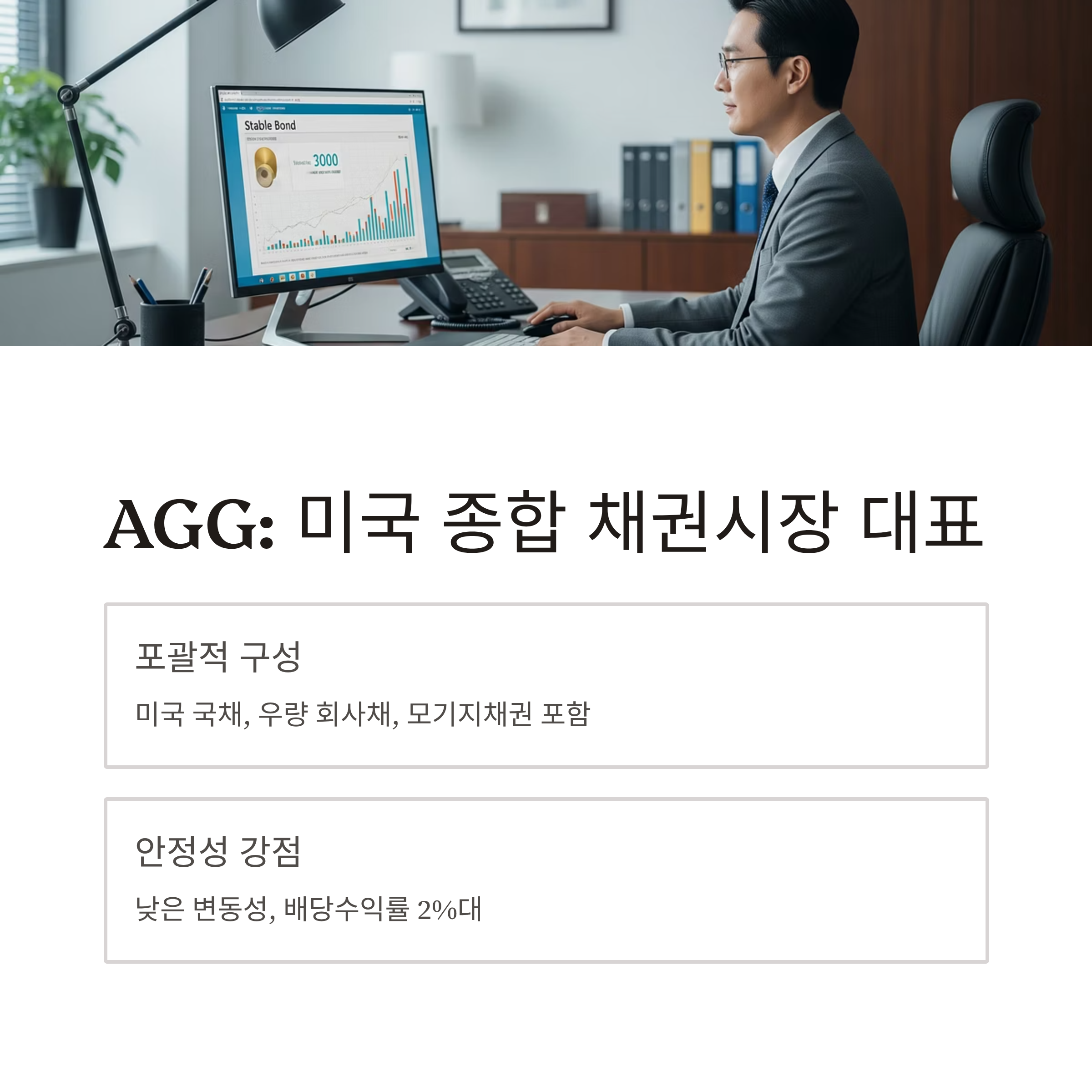 미국 국채, 우량 회사채, 모기지채권 등을 포괄하는 미국 종합 채권시장 대표 ETF입니다. 상대적으로 낮은 변동성과 높은 안정성이 강점이며, 배당수익률은 2%대 수준입니다.
