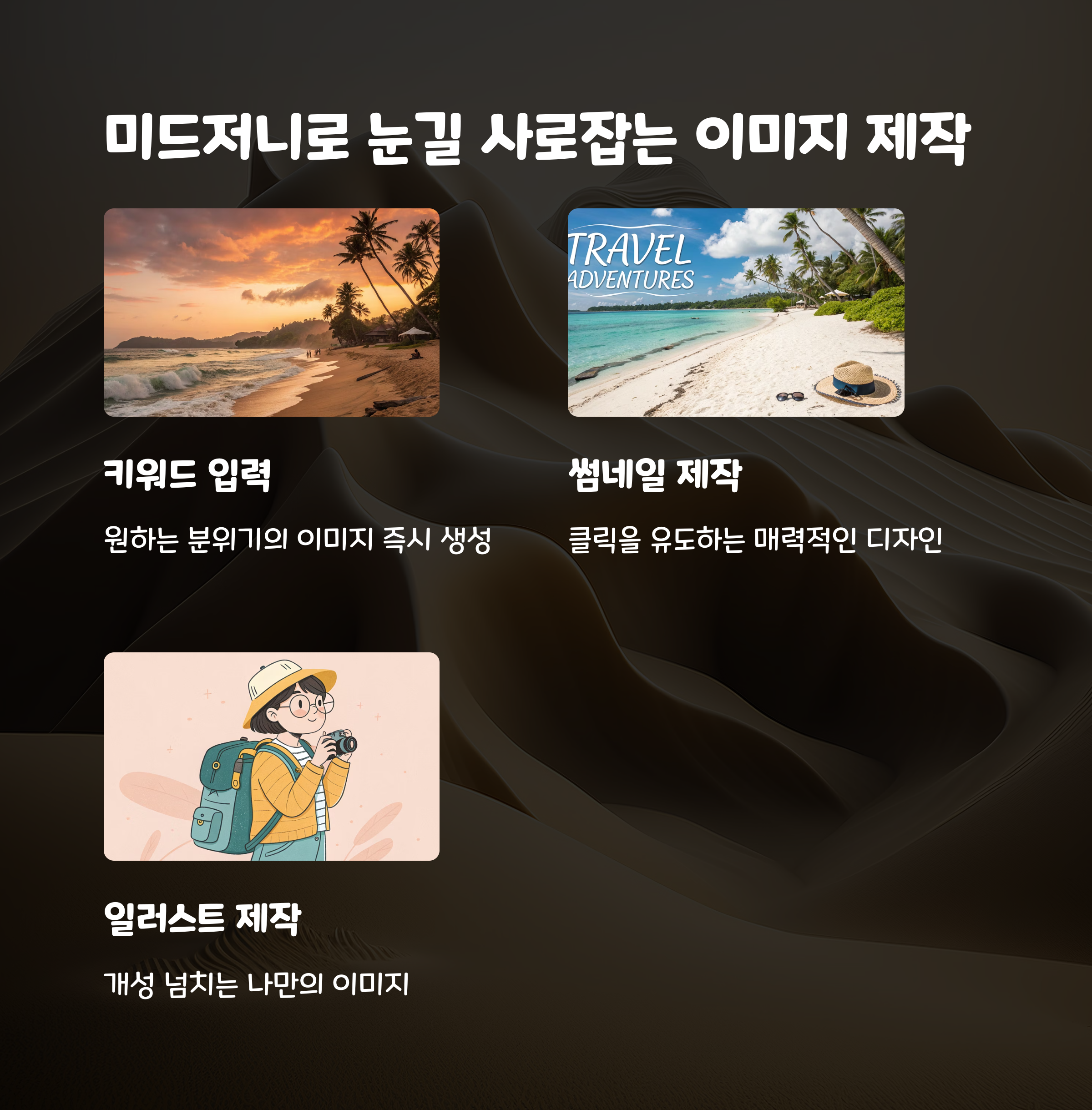 챗GPT로 글이 완성되면, 이제는 이미지 차례입니다. 미드저니는 텍스트 프롬프트(지시문)를 입력해 콘텐츠의 메시지를 시각적으로 표현하는 이미지 AI입니다. 예를 들어 “퇴사 후 1인 창업을 준비하는 여성의 노트북 작업 장면” 같은 문장을 영어로 변환해 미드저니에 입력하면, 실제 블로그나 SNS에 활용 가능한 수준 높은 일러스트 또는 사진 스타일 이미지가 생성됩니다. 브랜딩된 느낌을 주면서도 직접 촬영 없이 제작이 가능하기 때문에 혼자서 콘텐츠 제작을 해야 하는 1인 창작자에게 매우 유용한 툴입니다.