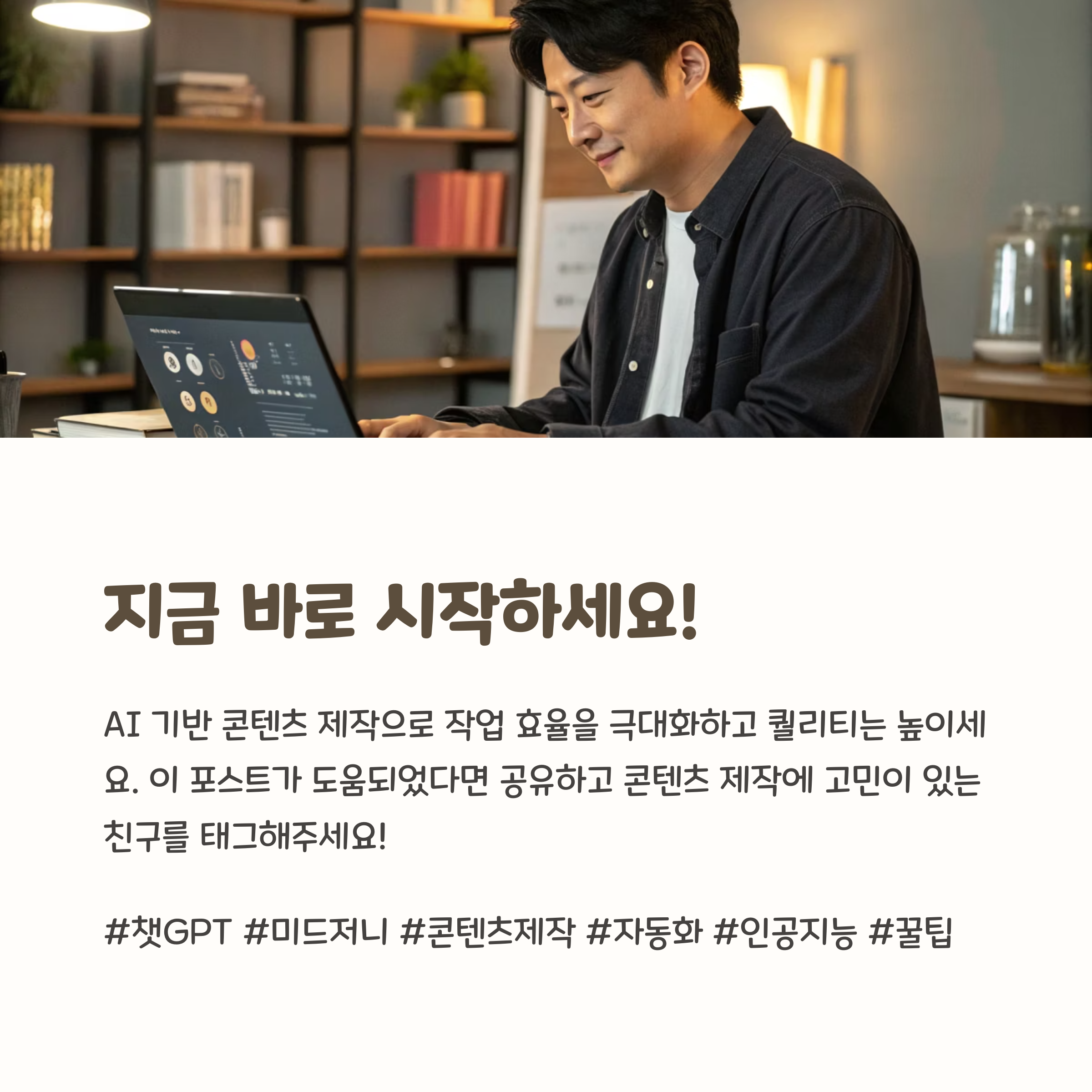 AI 도구는 더 이상 전문가만의 전유물이 아닙니다. 챗GPT와 미드저니만으로도 누구나 혼자서 매일 콘텐츠를 만들고 수익 구조를 설계할 수 있습니다. 가장 중요한 건 매일 1포스트라도 쌓아가는 루틴. 오늘부터 여러분의 콘텐츠 루틴을 시작해보세요.