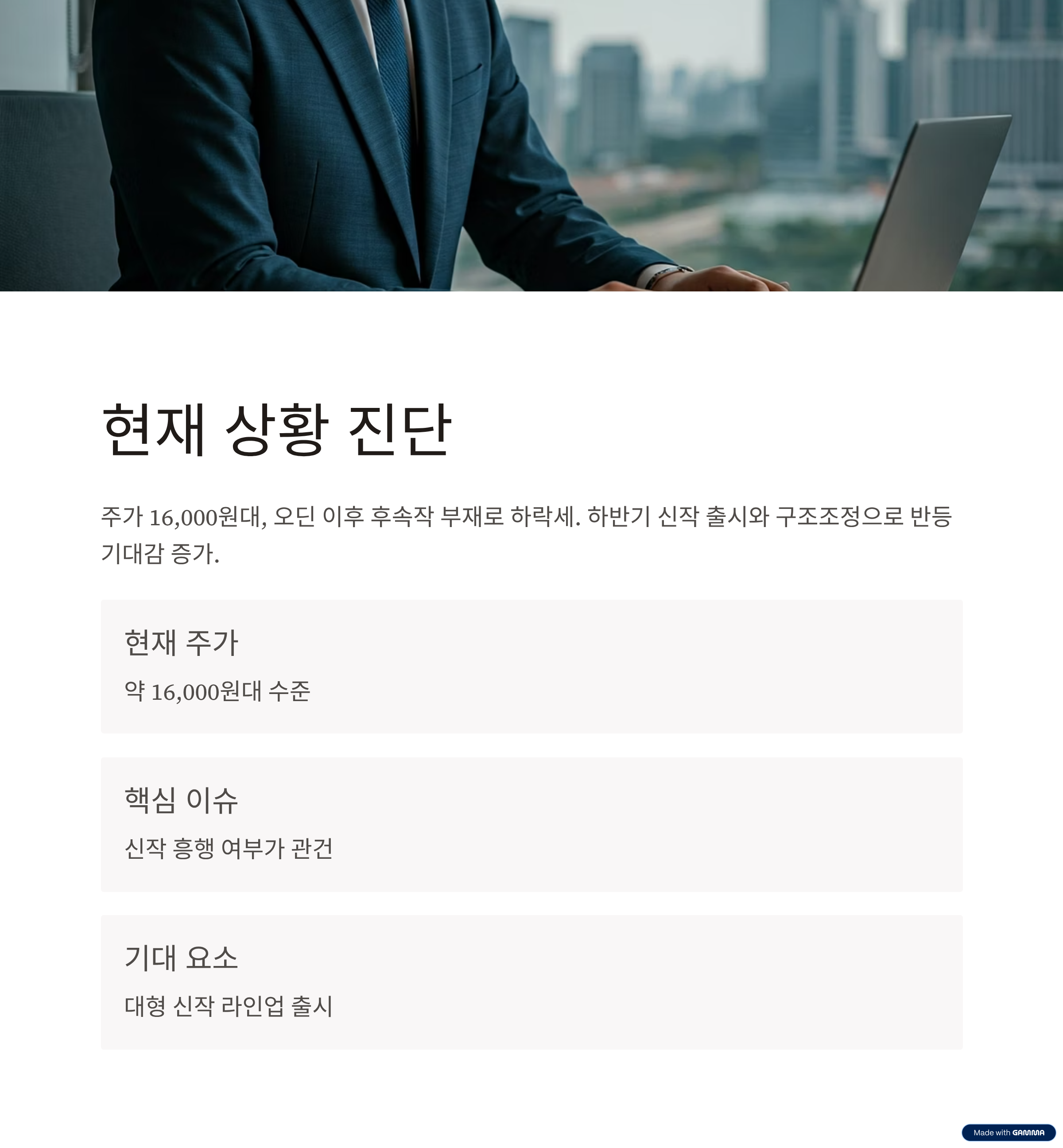 | 보수적 | 8,000 ~ 15,000원 | –50% ~ –6% | 신작 실패, 적자 지속, 게임 시장 경쟁 심화 |