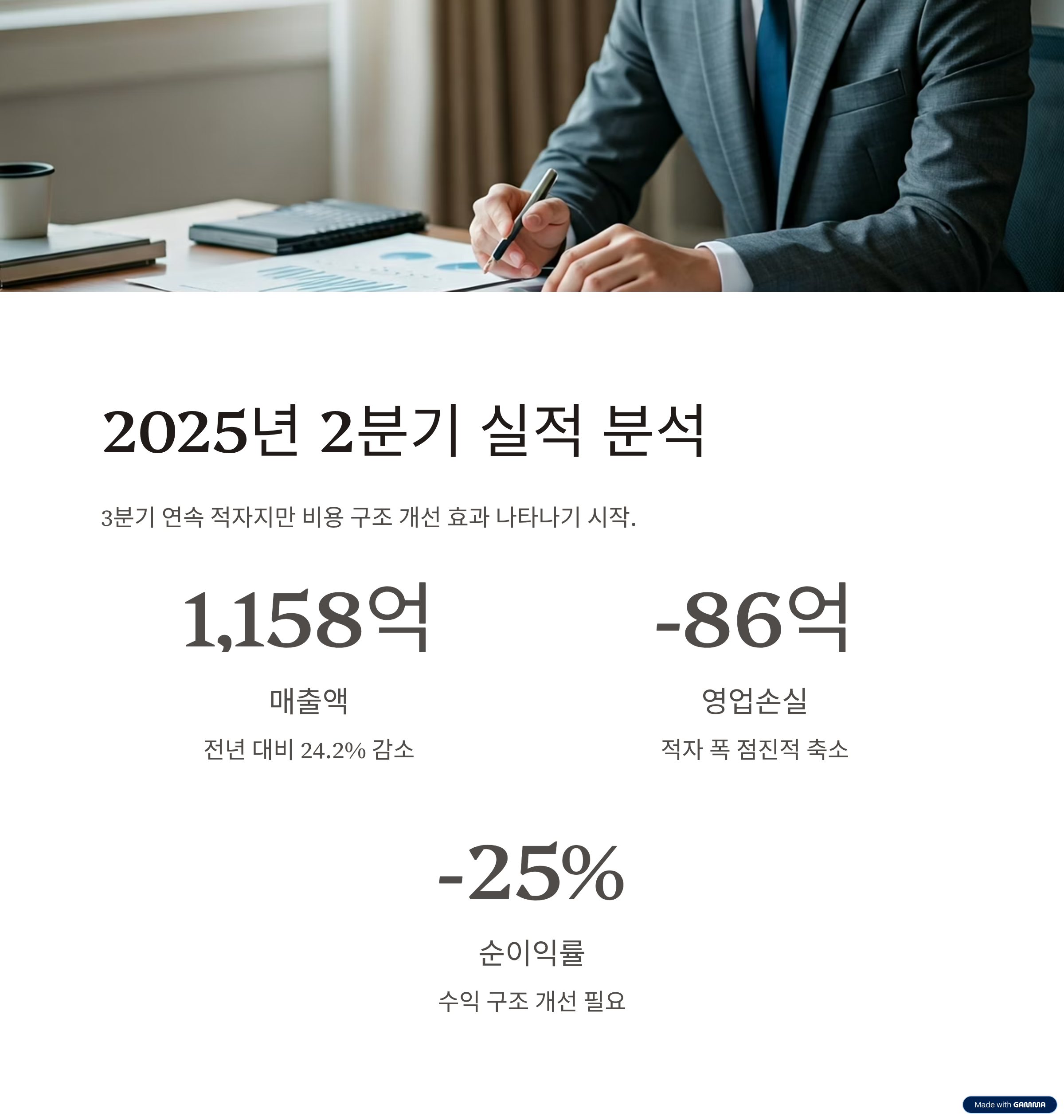 | 영업이익 | –86억 원 (적자) | 수익성 개선은 제한적이나 비용 효율화 효과 일부 반영 |