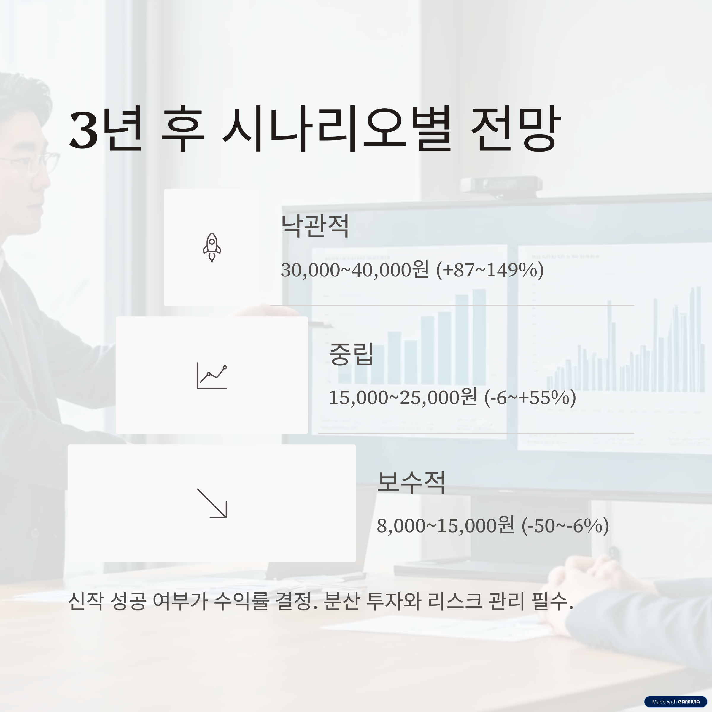 | 낙관적 | 30,000 ~ 40,000원 | +87% ~ +149% | 신작 대성공, 수익성 복귀, 기관 유입, 글로벌 확장 |