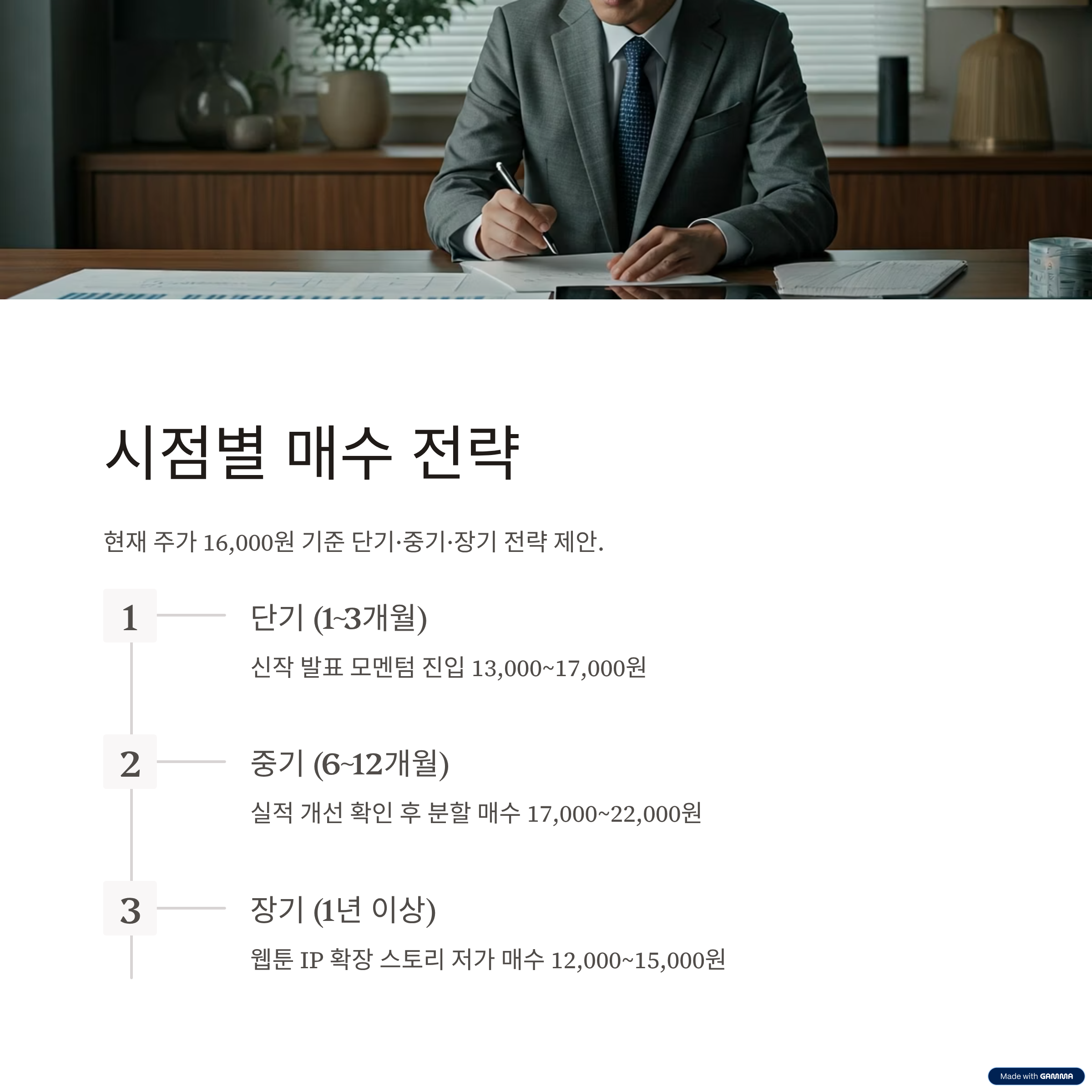 | 장기 (1년 이상) | 웹툰 IP 확장 등 장기 스토리 확신 있을 경우 저가 매수 | 12,000 ~ 15,000원 |