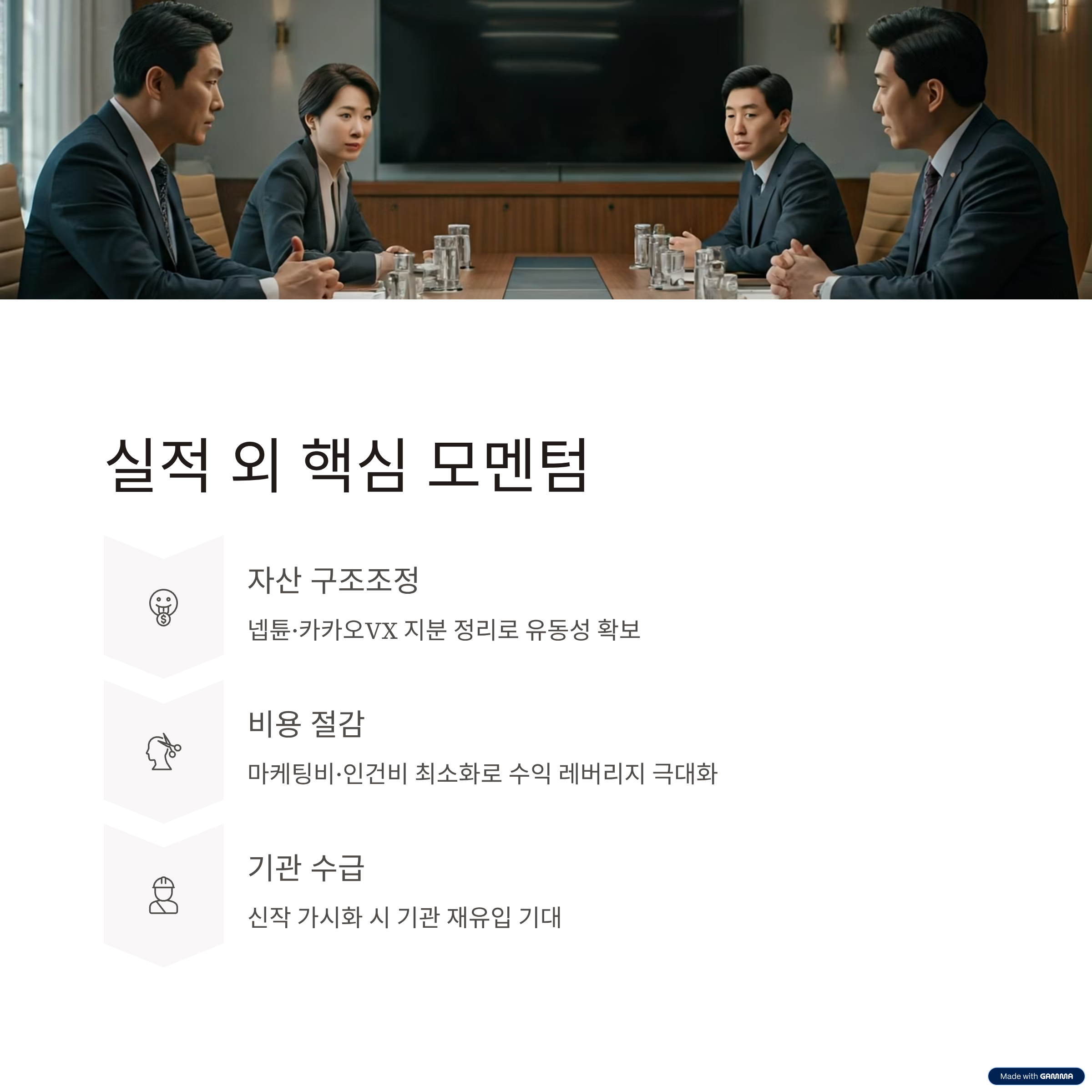 - 넵튠 지분 전량 매각 / 카카오VX 지분 정리 계획 → 비핵심 자산 정리로 유동성 확보