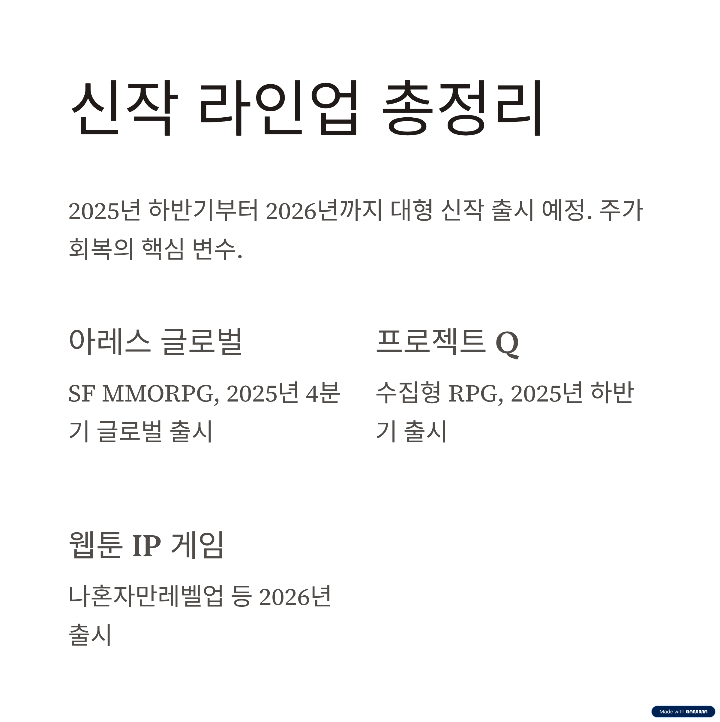 2025년 하반기부터 2026년까지의 신작 라인업이 주가 회복의 가장 큰 변수입니다. 특히 ‘아레스 글로벌’과 ‘프로젝트 Q’는 각각 그래픽/액션성과 글로벌 진출 기대감으로 주목받고 있으며, 라인업 다양화와 함께 웹툰 기반 IP 게임 출시 전략도 점차 구체화되고 있습니다.
