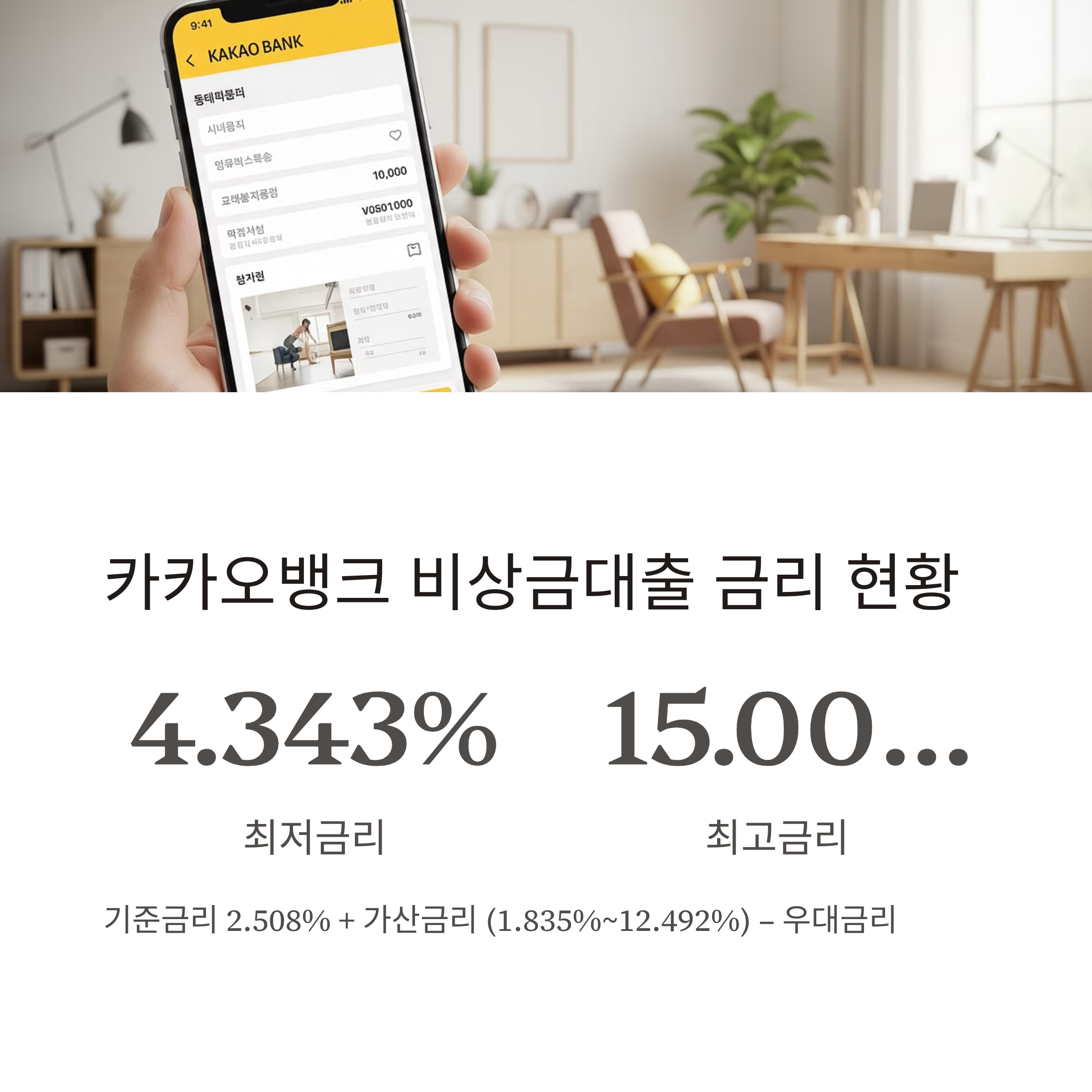 기준금리 2.508% + 가산금리 (1.835%~12.492%) – 우대금리 적용