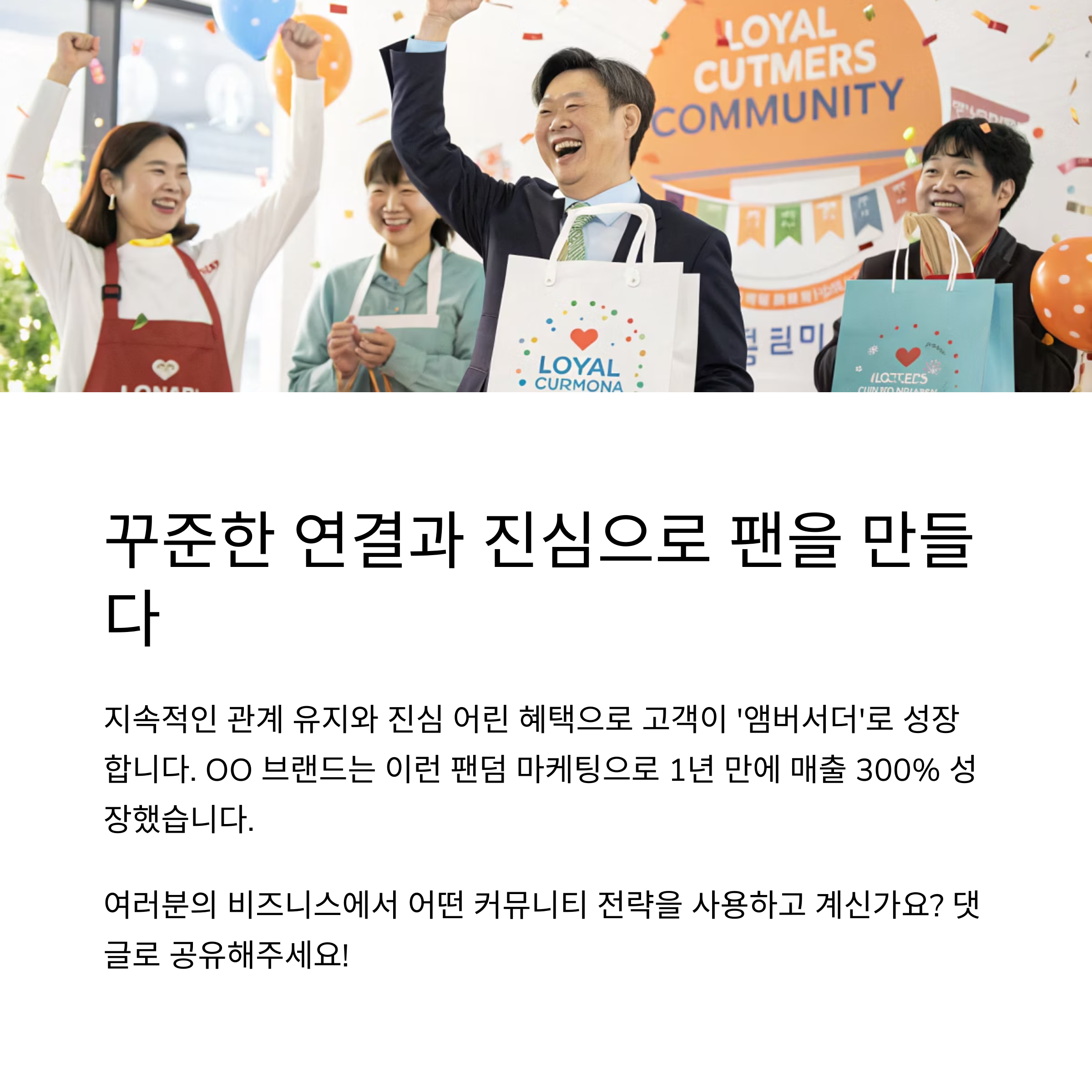 커뮤니티 기반 창업은 속도보다 방향이 중요합니다. 상품보다 소통, 광고보다 연결, 판매보다 관계. 팬층은 하루아침에 생기지 않지만, 진심과 일관성이 쌓이면 결국 고객이 브랜드가 되는 구조를 만들 수 있습니다.
