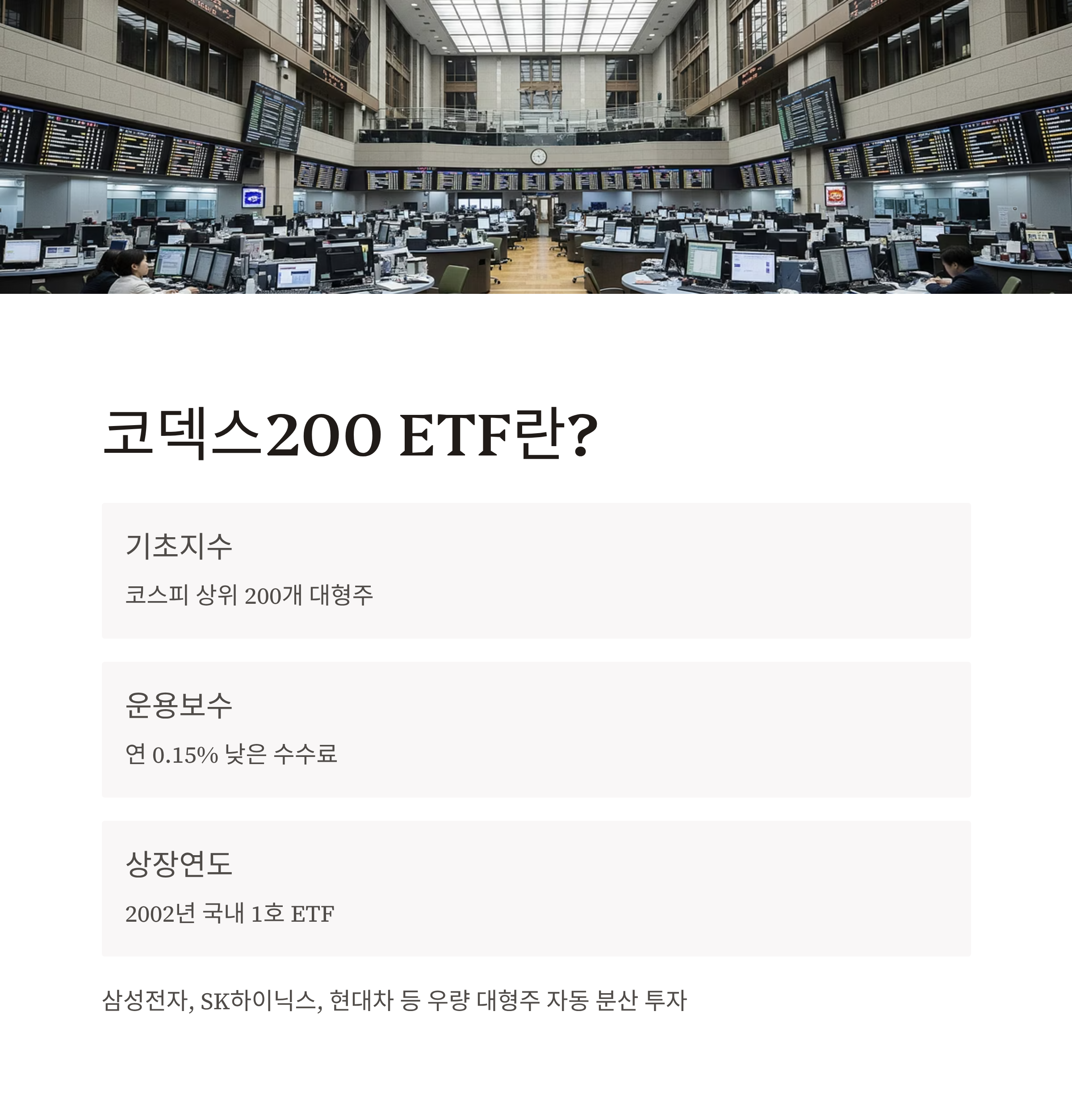 코덱스200은 코스피 시장에서 우량 대형주 200개에 자동 분산 투자되는 구조입니다. 개별 주식을 고르지 않아도, 국가 대표 지수를 통째로 사는 전략이 가능하다는 점에서 장기 투자자에게 인기입니다.