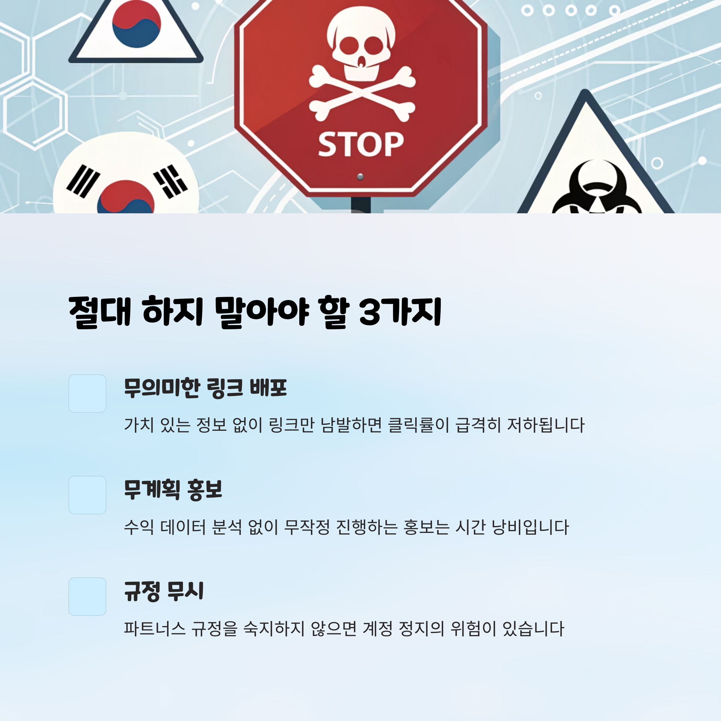 | 과도한 홍보 | 중복된 광고처럼 보임 | 방문자 신뢰 손실 | 질 높은 콘텐츠 제작 |
