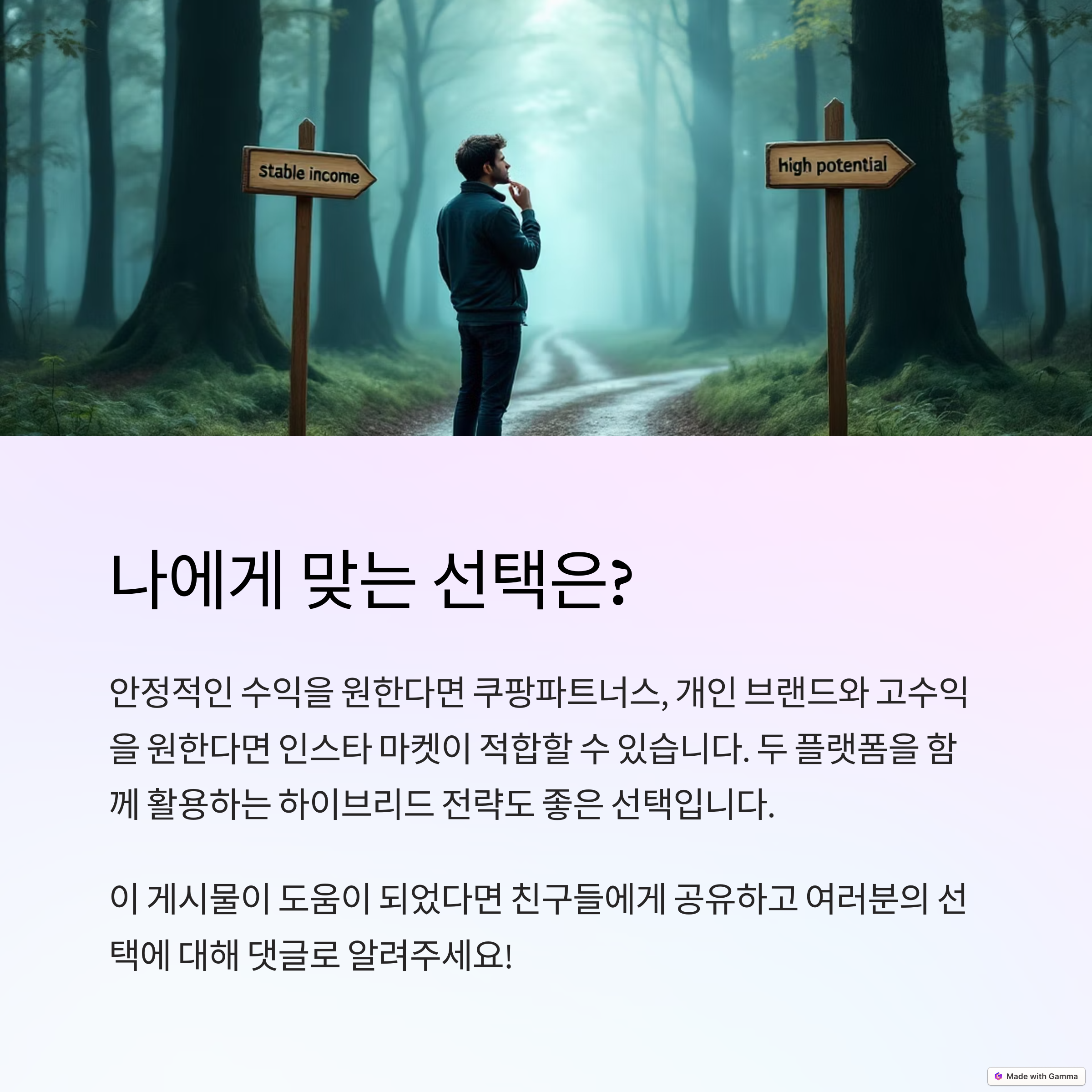 쿠팡파트너스와 인스타 마켓 중 어떤 플랫폼을 선호하시나요? 선택한 이유와 경험을 댓글로 공유해주세요. 여러분의 소중한 의견을 기다리고 있습니다!