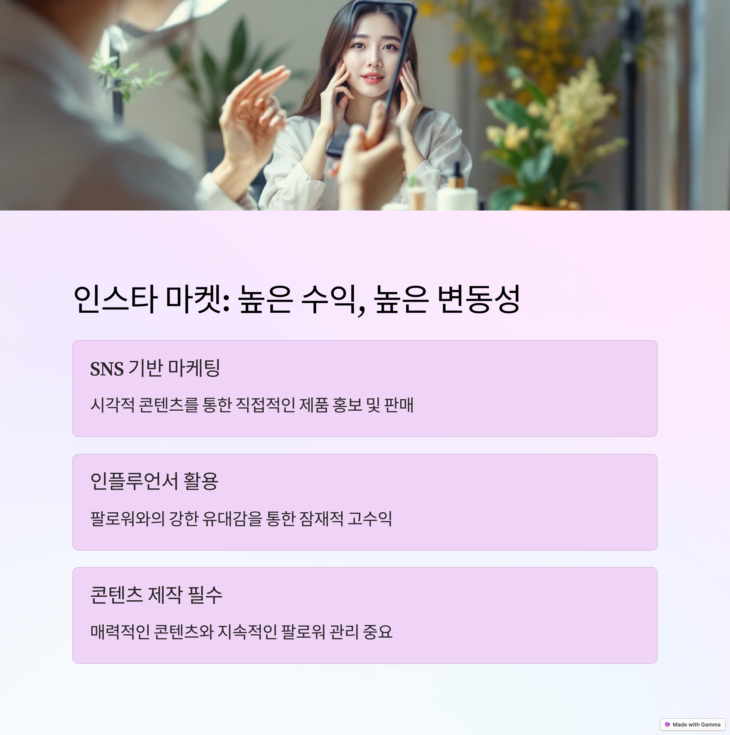 반면, 인스타 마켓은 SNS를 활용하여 제품을 홍보하는 마케팅 방식입니다. 인스타그램과 같은 플랫폼을 통해, 사용자는 자신이 원하는 제품을 홍보하거나 판매할 수 있습니다. 이 방식은 인플루언서들이나 일반 사용자들이 직접 제품을 홍보하면서, 이를 통해 파트너십 계약을 통해 수익을 창출하는 방식입니다. 이 경우 수익은 보통 판매된 제품의 일정 비율로 지급되며, 인스타그램의 광고 수익이나 협찬을 통해 더 큰 수익을 얻을 수 있습니다. 인스타 마켓은 판매자의 브랜딩과 소셜미디어 영향력을 활용하는 방식입니다.